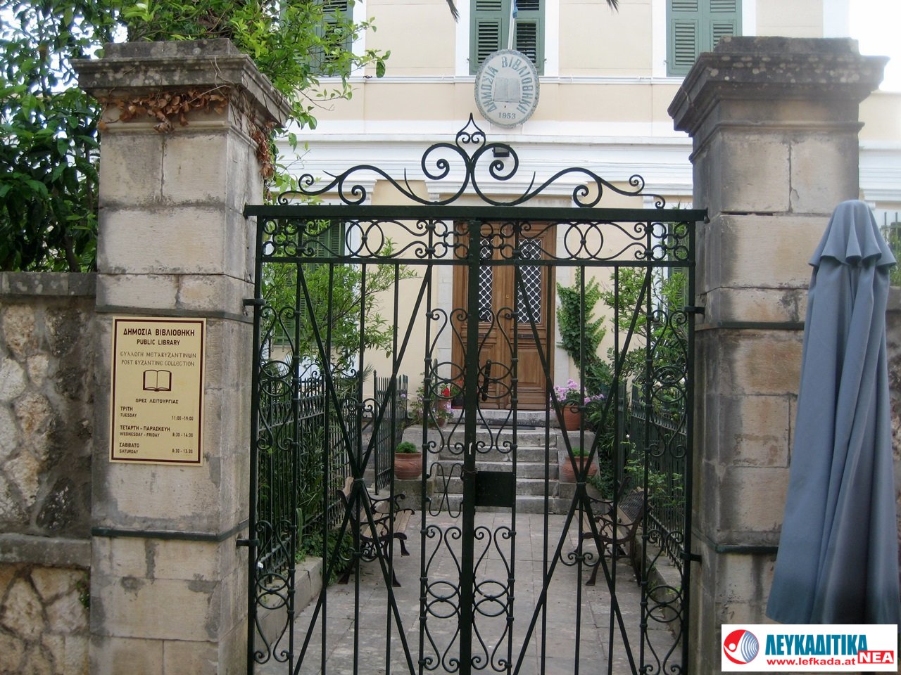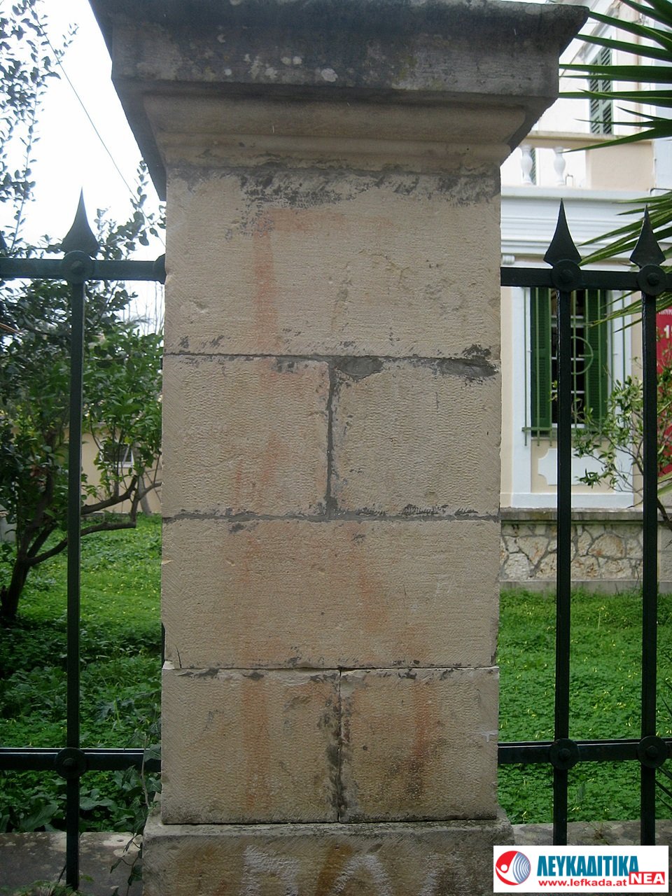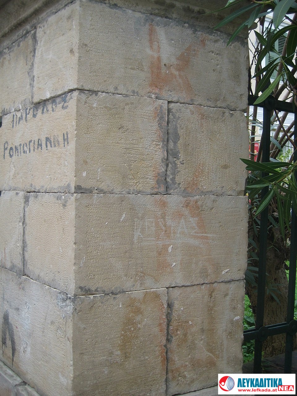 Κατά μήκος του πέτρινου αυλότοιχου, που περικλείει το κτίριο, υπάρχουν πέτρινα κολωνάκια πάνω στα οποία στηρίζεται το σφυρήλατο κάγκελο της περίφραξης. Από τη μεριά που είναι η κεντρική είσοδος της βιβλιοθήκης (οδός Λοχαγού Ροντογιάννη) οι κολώνες δεν είναι σοβατισμένες, όπως στον υπόλοιπο αυλότοιχο και έτσι μπορούν εύκολα να αναγνωστούν τα εξής συνθήματα: