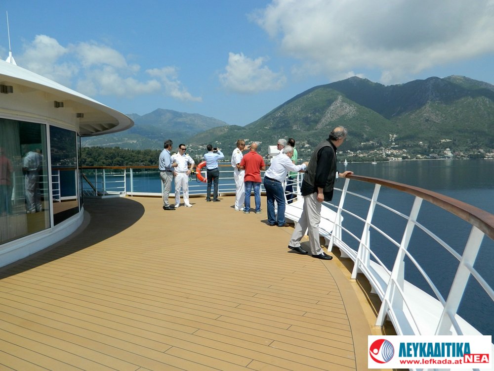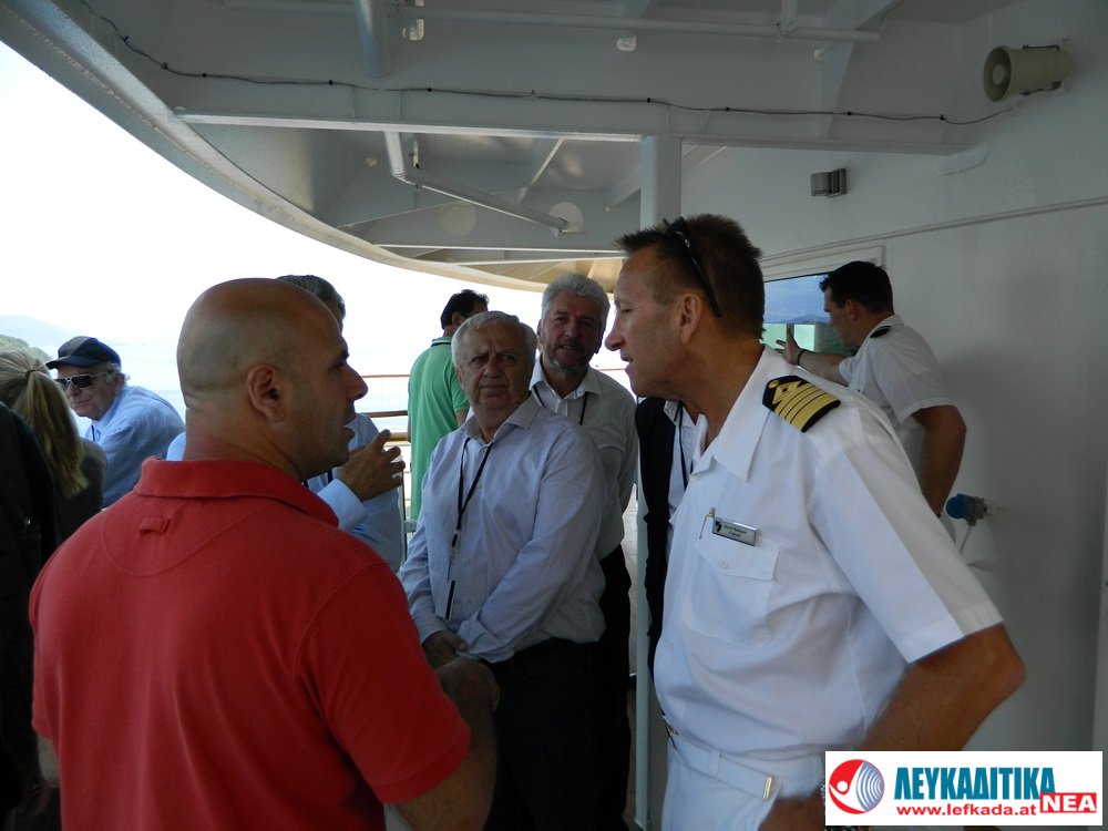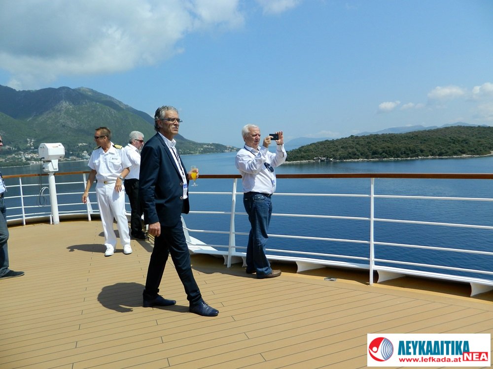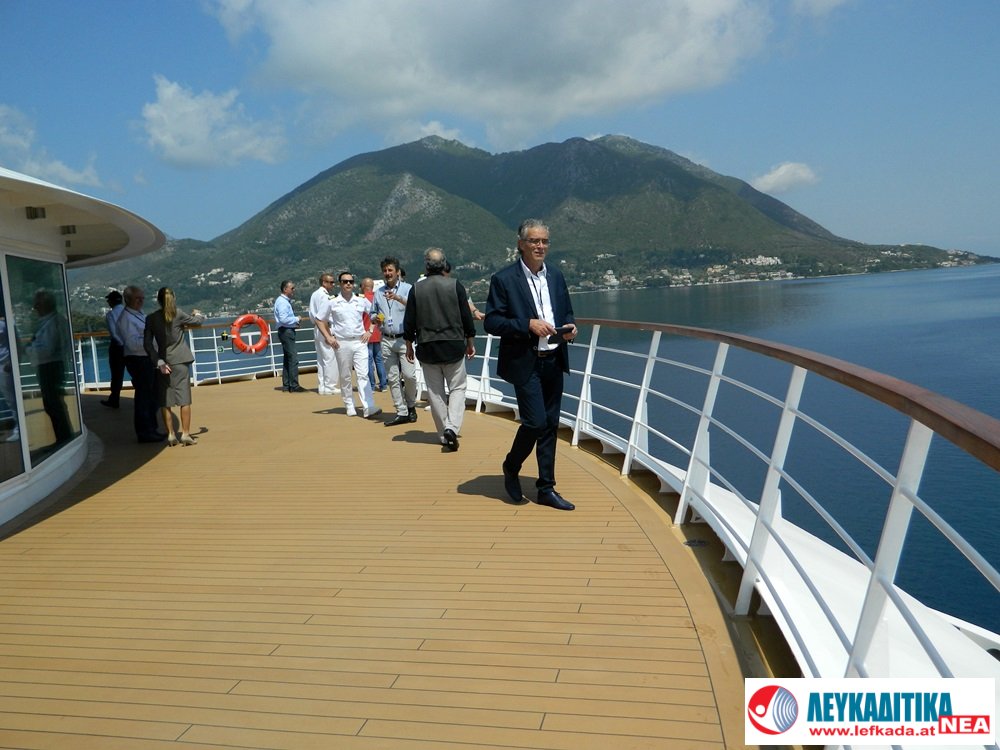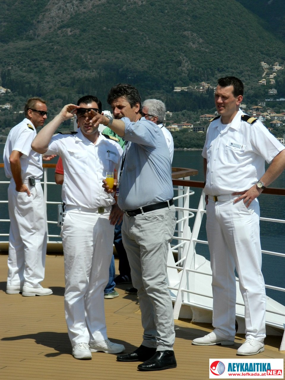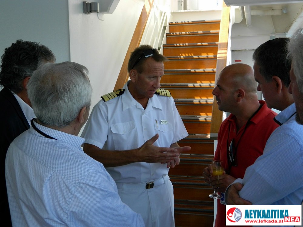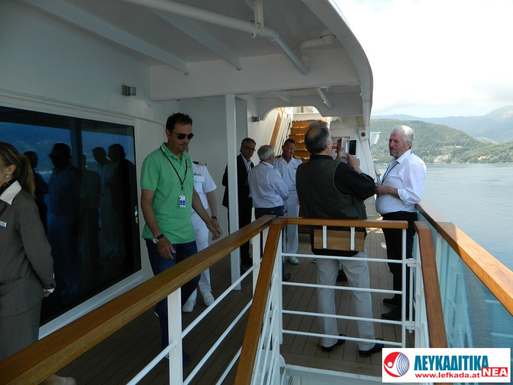 Ο καιρός επέτρεψε αυτή τη φορά να πραγματοποιηθεί η εθιμοτυπική επίσκεψη των εκπροσώπων του επιχειρηματικού κόσμου και της τοπικής Αυτοδιοίκησης στο κρουαζιερόπλοιο. Το πλοίο επισκέφτηκε αντιπροσωπεία του Επιμελητηρίου με επικεφαλής τον πρόεδρο κ. Σωτήρη Σκιαδαρέση, ο πρόεδρος της Ομοσπονδίας Τουριστικών Καταλυμάτων κ. Διονύσης Γαζής, ο Δήμαρχος Λευκάδας κ. Κώστας Δρακονταειδής, ο Αντιπεριφερειάρχης κ. Θεόδωρος Χαλικιάς και ο πρόεδρος του Λιμενικού Ταμείου κ. Κωνσταντίνος Βλάχος. Στα πλαίσια της επίσκεψης έγινε ανταλλαγή αναμνηστικών δώρων, ενώ ο καπετάνιος του πλοίου κ. David Bathgate δήλωσε στους επισκέπτες ότι δεν αντιμετωπίζει κάποιο ιδιαίτερο πρόβλημα με την προσέγγιση του πλοίου.