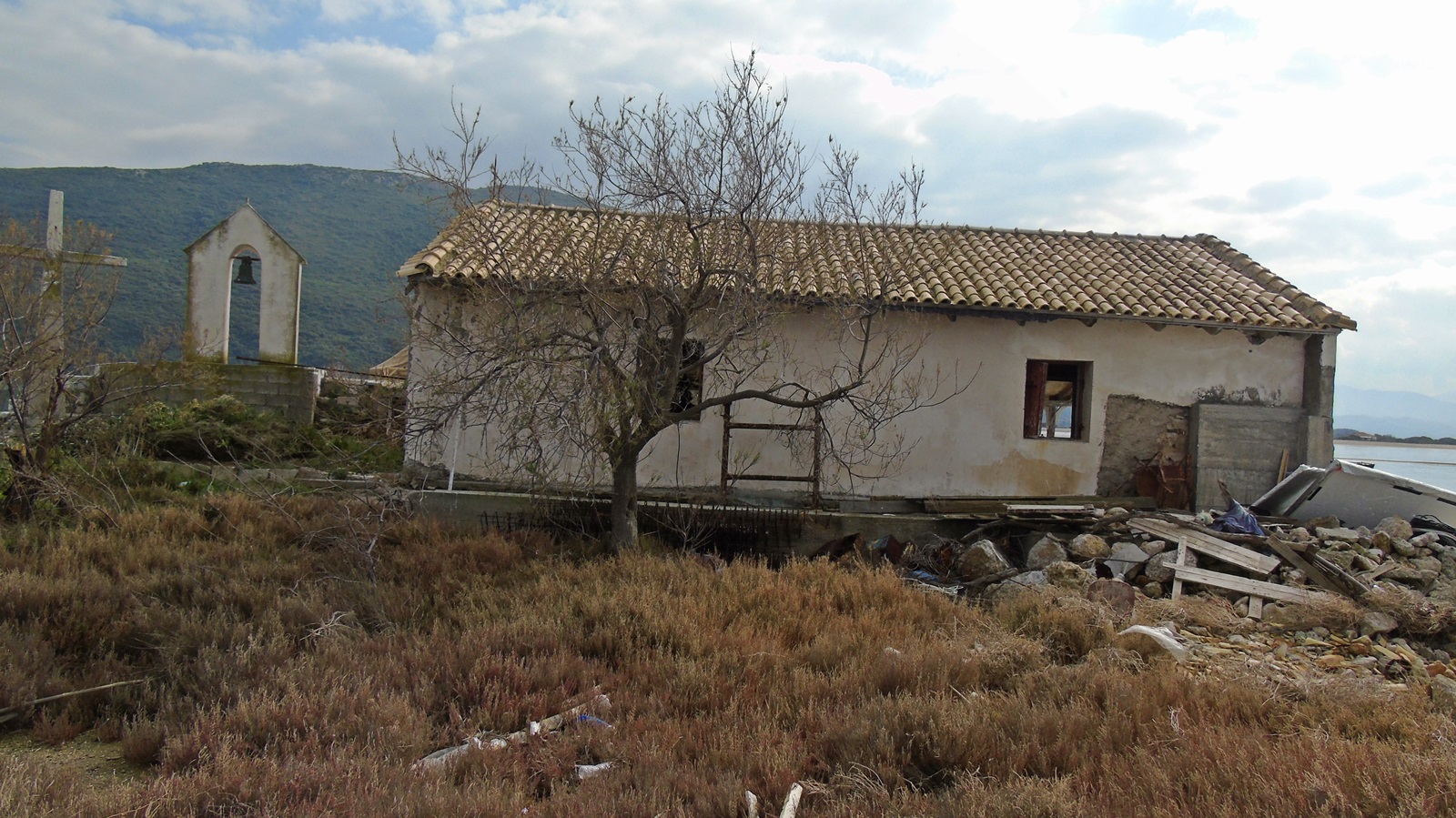 Εδώ πρέπει να γίνει όλο εκείνο το τοιχίο με μπλόκια. Να ρίξουν μπλόκια από μέσα, τσιμέντα. Κι ό,τι υλικό άλλο μπορούμε να πάρουμε. Οι ρωγμές έγιναν φέτος. Η θάλασσα ήταν μέσα. Τώρα σπάσανε αυτές. Το παρακολουθώ ολοχρονίς. Εγώ φτιάχνω εδώ πέρα. Εγώ έφτιαξα τη σκεπή, το ταβάνι μέσα, τα μπετά πίσω. Δεν πληρώνομαι, δουλεύω αφιλοκερδώς. Τώρα θέλω να φέρω επτά πισο-κολόνες να αλλάξω αυτές εδώ. Όλα εγώ τα έφτιαξα αυτά. Έχω και δικά μου έξοδα, δεν πληρώνομαι. Ό,τι μου δίνουν, δυο τσιμέντα… Εδώ πρέπει να γίνει το τοιχίο πίσω από την εκκλησία. Να ρίξουν μπλόκια από μέσα, τσιμέντα. Θέλει να γίνουν τα μπλόκια από μέσα. Θέλει υλικά και κάνα φράγκο να πληρώνουν κάνα μεροκάματο. Δεν γίνεται αλλιώς. Εγώ δεν μπορώ να τα αναλάβω όλα μόνος μου. Για βάλτε το στο δημοτικό συμβούλιο να δούμε, μήπως γίνει τίποτα».