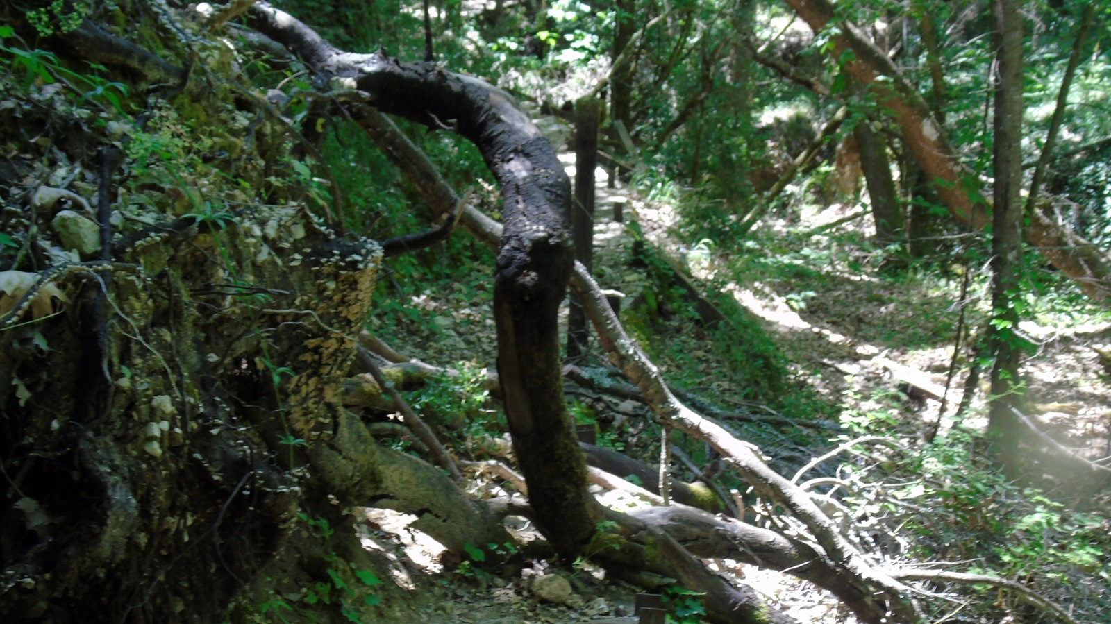 Ούτε λόγος να γίνεται για «άριστα διαμορφωμένα μονοπάτια με προστατευτικά ξύλινα κιγκλιδώματα». Στη μέση περίπου του μονοπατιού έχει πέσει ένας μικρός όχθος, ο οποίος συμπαρέσυρε και κάποια δέντρα με αποτέλεσμα το μονοπάτι να έχει κοπεί στα δύο. Ελάχιστα είναι τα σημεία όπου σώζονται ακόμη τα «πάλαι ποτέ» ξύλινα κιγκλιδώματα καστανιάς. Τα περισσότερα έχουν πέσει και κείτονται κατεστραμμένα στα κατάντη του μονοπατιού.