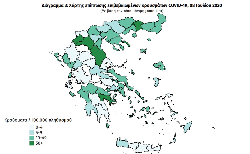 Όμως, στην ημερήσια έκθεση της επιδημιολογικής επιτήρησης της λοίμωξης από το νέο κορωνοϊό (COVID-19) της 8ης Ιούλη και στον ενσωματωμένο χάρτη του ΕΟΔΥ, ο οποίος αποτυπώνει τη γεωγραφική κατανομή των συνολικών κρουσμάτων COVID-19 ανά Περιφερειακή Ενότητα της χώρας, με βάση την δηλωθείσα διεύθυνση μόνιμης κατοικίας του ασθενούς, εμφανίζεται ως δια μαγείας η Λευκάδα με πράσινο χρώμα (μαζί με την Ζάκυνθο και την Κέρκυρα από τα άλλα Ιόνια νησιά), που σημαίνει, σύμφωνα με το υπόμνημα του χάρτη, περισσότερα του ενός επιβεβαιωμένα κρούσματα (10-49 κρούσματα ανά 100.000 πληθυσμού).