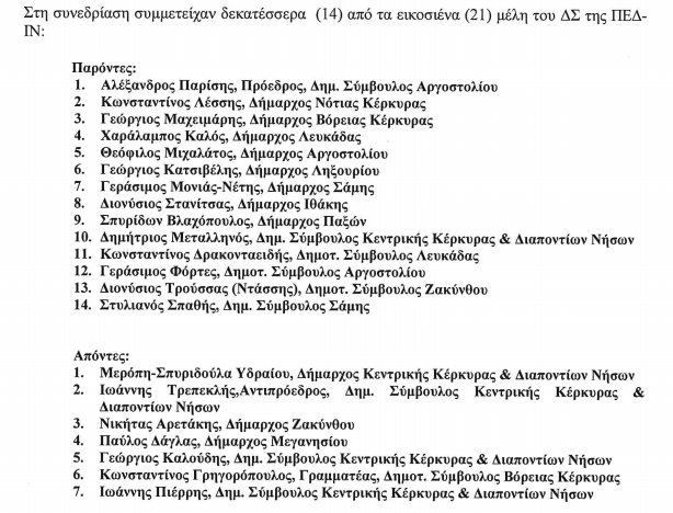 Όσο δε αφορά στο ερώτημα άλλου αναγνώστη μας, που γράφει ότι «ιδιαίτερο ενδιαφέρον θα έχει να γνωρίζαμε ποια η σύνθεση του ΔΣ στην εν λόγω ομόφωνη απόφαση, και το σκεπτικό τους, που ίσως προκύπτει από την διαλογική συζήτηση, …. προκειμένου να δούμε αν απλά αποτελεί ένα ακόμα «κλασικό» ψήφισμα σούπα», στη συνεδρίαση του ΔΣ της ΠΕΔ Ιονίων Νήσων πήραν μέρος οι εξής: