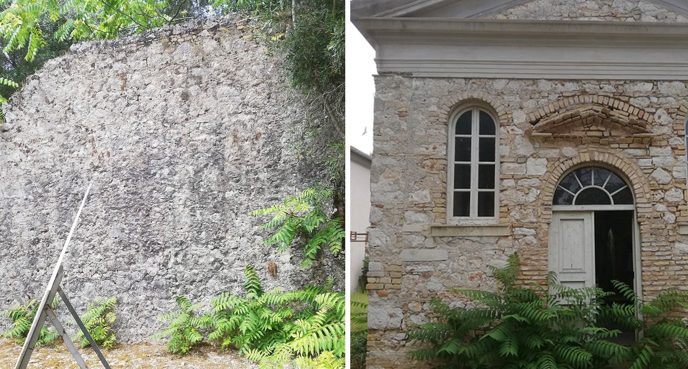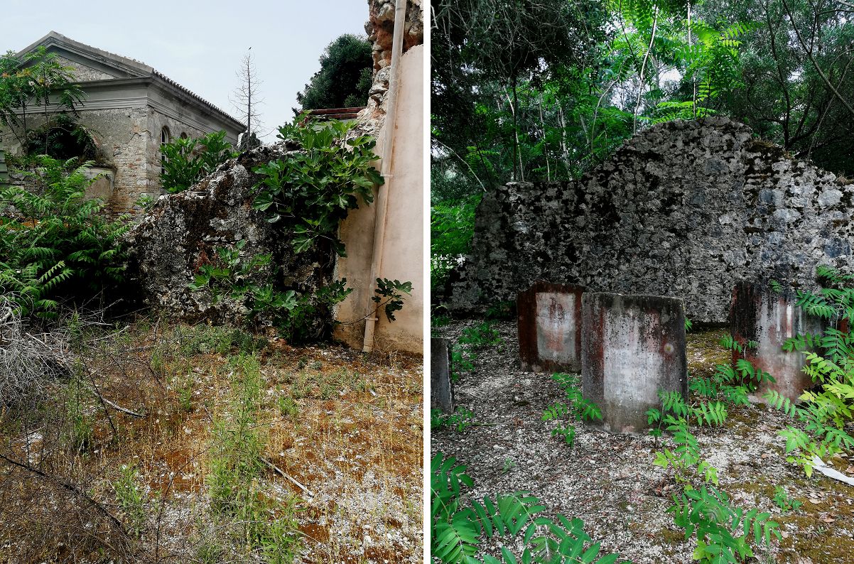 Όψη καταρρέοντος τοιχίου πίσω από την εκκλησιά κι άλλες όψεις εγκατάλειψης του τοπίου
