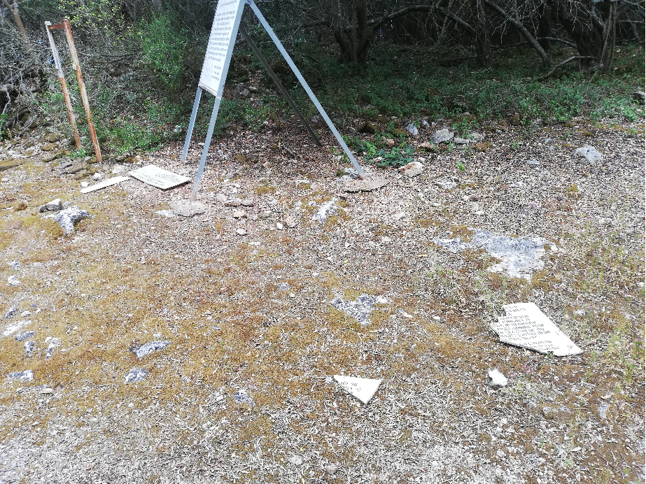 Υπολείμματα πελεκημένης-θρυμματισμένης μαρμάρινης επιγραφής για τους εκτελεσμένους, δίπλα στον Τοίχο των Εκτελέσεων