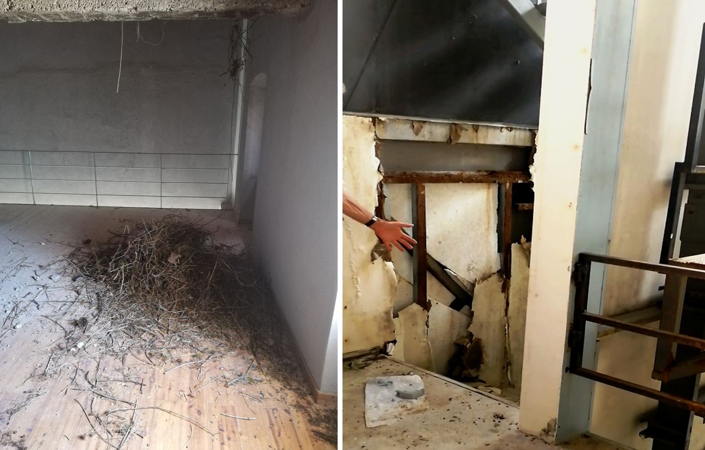 Εικόνες σοκαριστικές με κάθε είδους καταστροφές πιθανώς με βαριοπούλες, με λεηλασία, με υπολείμματα κάρβουνων, με συγκεντρωμένα εύφλεκτα υλικά, με φωλιές πουλιών σε παραβιασμένα παράθυρα, με κλαδιά, με λειψόν-λεηλατημένο λόγω αρπαγών ηλεκτρολογικό, μηχανολογικό και ηλεκτροπαραγωγικό εξοπλισμό στον διάπλατο εσωτερικό χώρο-ξέφραγο αμπέλι και στον πίσω υπαίθριο χώρο του μελλοντικού Μουσείου, με γκρεμισμένες/σπασμένες πόρτες εισόδου.
