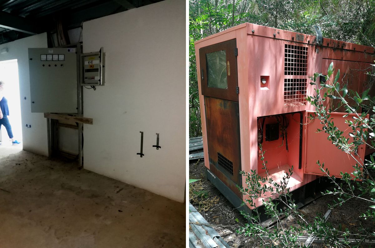 Δύο ηλεκτροπαραγωγά ζεύγη σημαντικής αξίας στέκουν έξω από το κτίριο λεηλατημένα, αχρηστευμένα, με αφαιρεμένα τα βασικά στοιχεία της λειτουργίας τους.