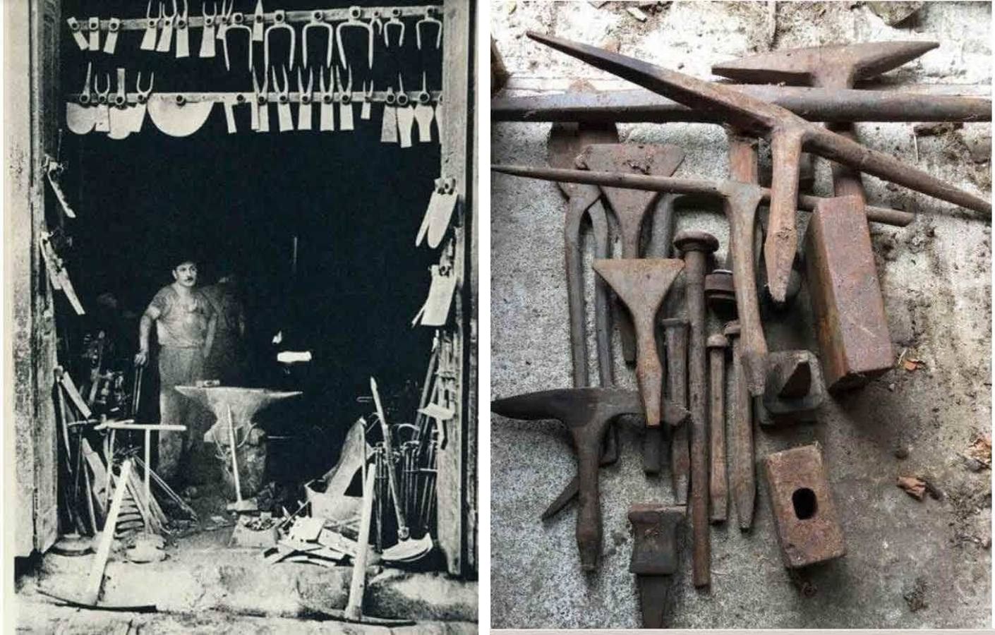 Τα δικά του βασικά του εργαλεία ήταν ένα τεράστιο αμόνι που πάνω του σμίλευε κυριολεκτικά το σίδερο με την βαριά και του έδινε μορφή με την βοήθεια της φωτιάς. Είχε ακόμα τη μέγγενη για να σφίγγει γερά τα σίδερα και πολλές τσιμπίδες και σφυριά που άλλοτε ήταν πεταμένα καταγής ή τοποθετημένα με τάξη γύρω απ το αμόνι.