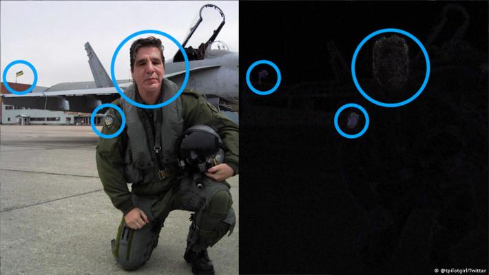Σύμφωνα με την DW, η ίδια φωτογραφία εμφανίστηκε στο διαδίκτυο πριν από χρόνια, αλλά με διαφορετικό κεφάλι, διαφορετικό σήμα στο χέρι και χωρίς σημαία στο βάθος. Η εικόνα προερχόταν από τη Βασιλική Αεροπορία του Καναδά.