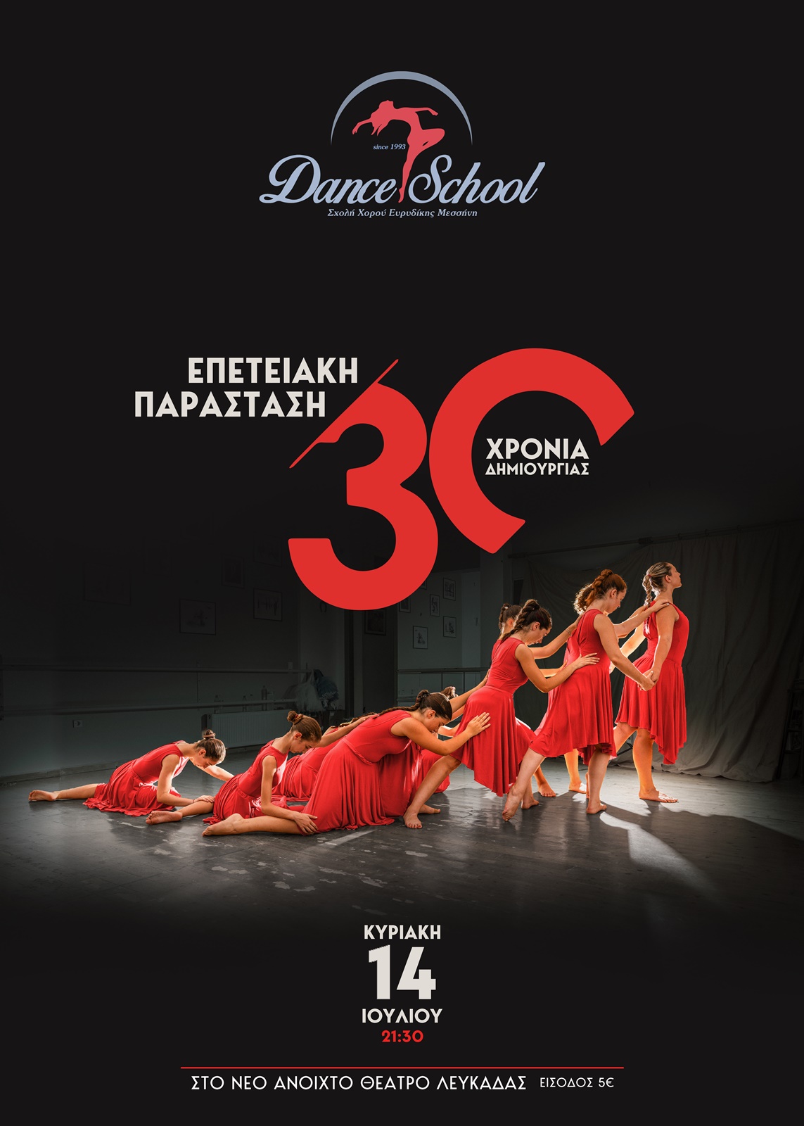 Την Κυριακή 14 Ιουλίου 2024, στις 21:30, στο νέο Ανοιχτό Θέατρο Λευκάδας, θα πραγματοποιηθεί η επετειακή παράσταση για τα 30 χρόνια δημιουργικής και δυναμικής παρουσίας στο χώρο του χορού της Σχολής Χορού Ευρυδίκης Μεσσήνη.