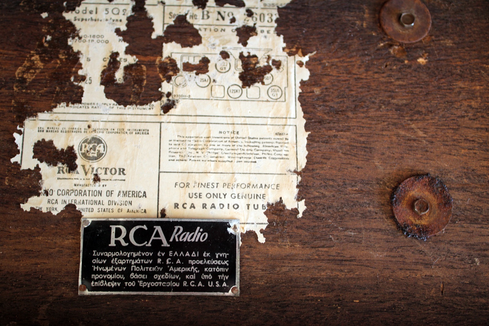 Συναρμολογημένον εν ΕΛΛΑΔΙ εκ γνησίων εξαρτημάτων R.C.A. προελεύσεως Ηνωμένων Πολιτειών Αμερικής κατόπιν προνομίου, βάσει σχεδίων, και υπό την επίβλεψιν του Εργοστασίου R.C.A. U.S.A.».