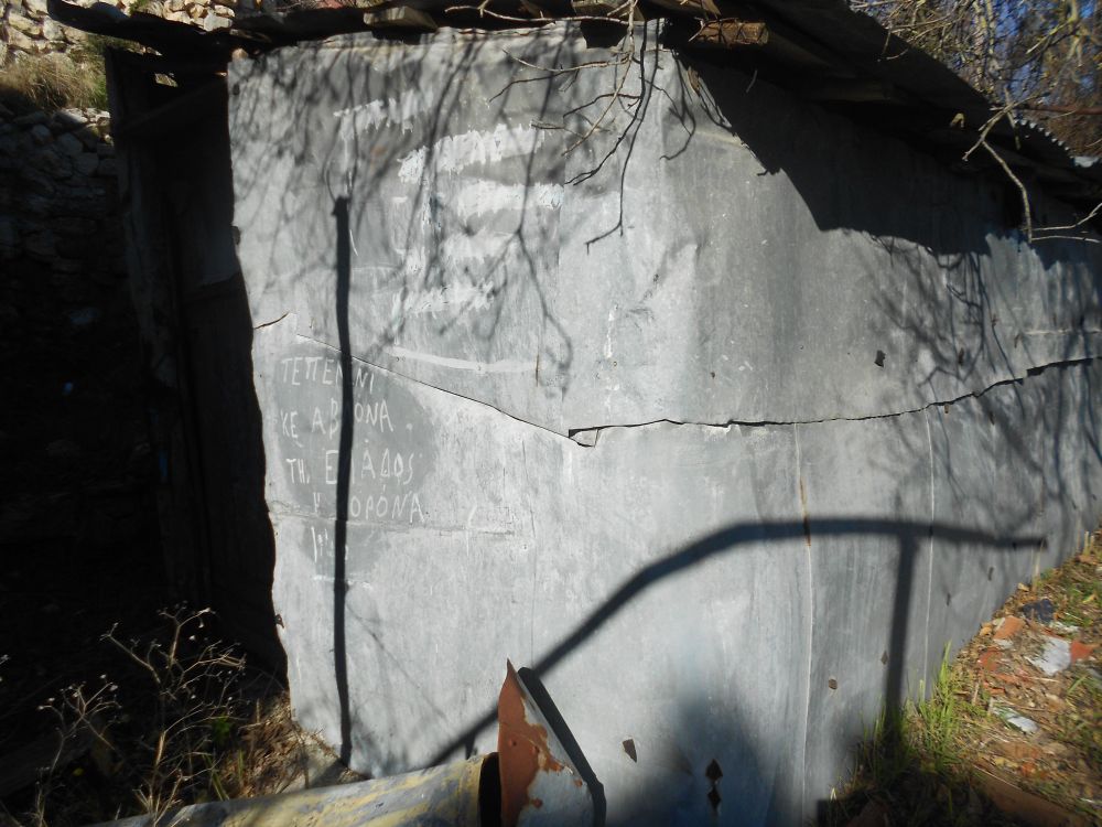 Για το διπλανό ανορθόγραφο «σύνθημα», που βρήκαμε γραμμένο στο τσίγκινο χώρισμα αχουριού -δίπλα από την πόρτα-, σε ένα απ” τα παλιά χωριά της ημιορεινής Λευκάδας: ΤΕΠΕΛΕΝΙ ΚΕ ΑΒΛΟΝΑ ΤΗΣ ΕΛΑΔΟΣ Η ΚΟΡΟΝΑ – 1940.