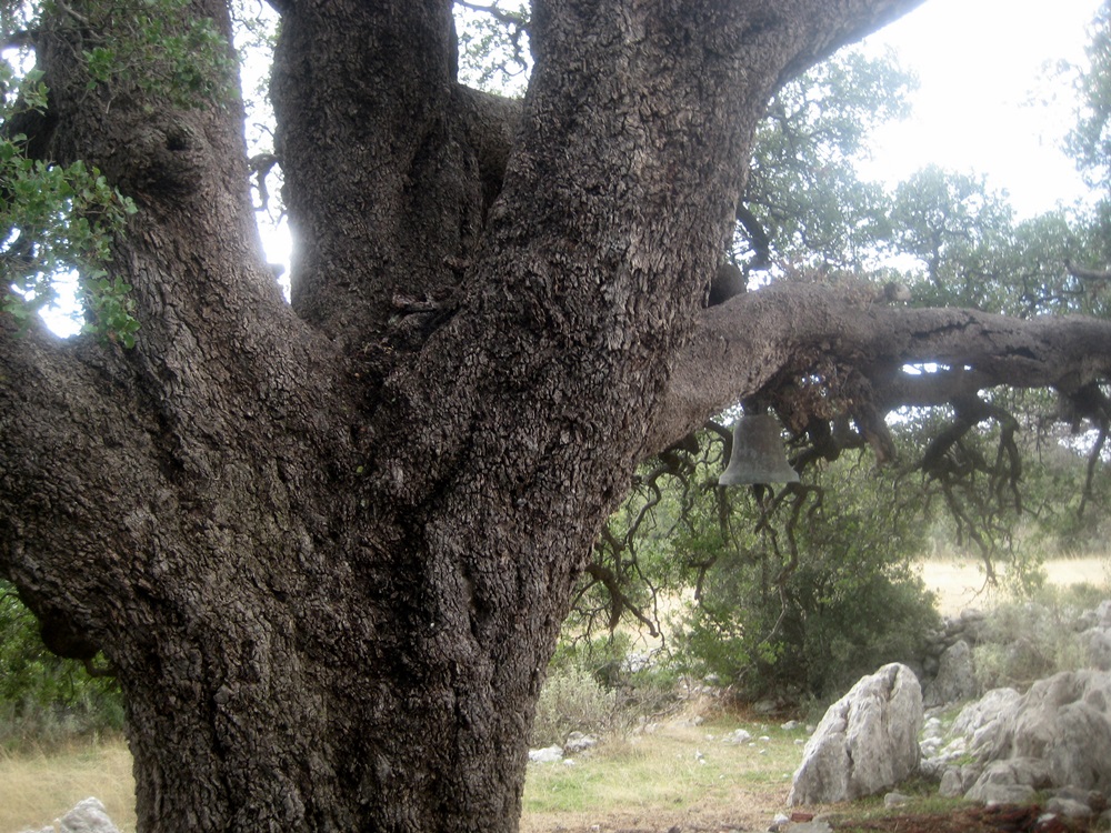 Στο αιωνόβιο πουρνάρι, δίπλα ακριβώς από το κτίσμα, κρεμασμένη μια παλιά καμπάνα, του 1940. Ο ήχος γλυκύτατος, μας θύμισε τα παιδικά μας χρόνια. Όχι σαν αυτές τις σημερινές με τους μεταλλικούς και μονότονους ήχους, που αν έχεις την ατυχία και βρίσκεσαι κοντά σε προετοιμάζουν για τον ωριλά ή στην χειρότερη των περιπτώσεων για τον ψυχίατρο.