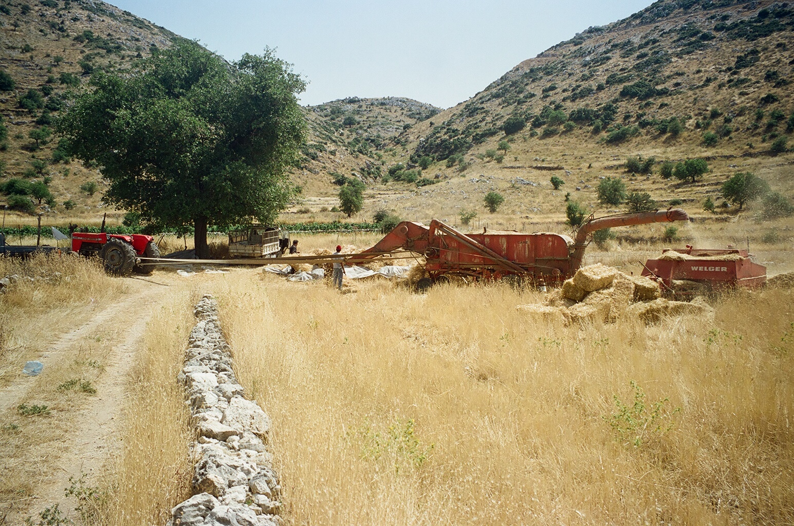 Το τρακτέρ ήταν δανεικό, από κάποιον από τα Λέλοβα. Το πρώτο (μάλλον γι΄ αυτό θα λέτε στο σχόλιό σας) ήταν γερμανικό μάρκας Λαντς (Heinrich Lanz AG in Mannheim), το δεύτερο στη σειρά που είχε για να κινεί την μηχανή ήταν μάρκας Force.