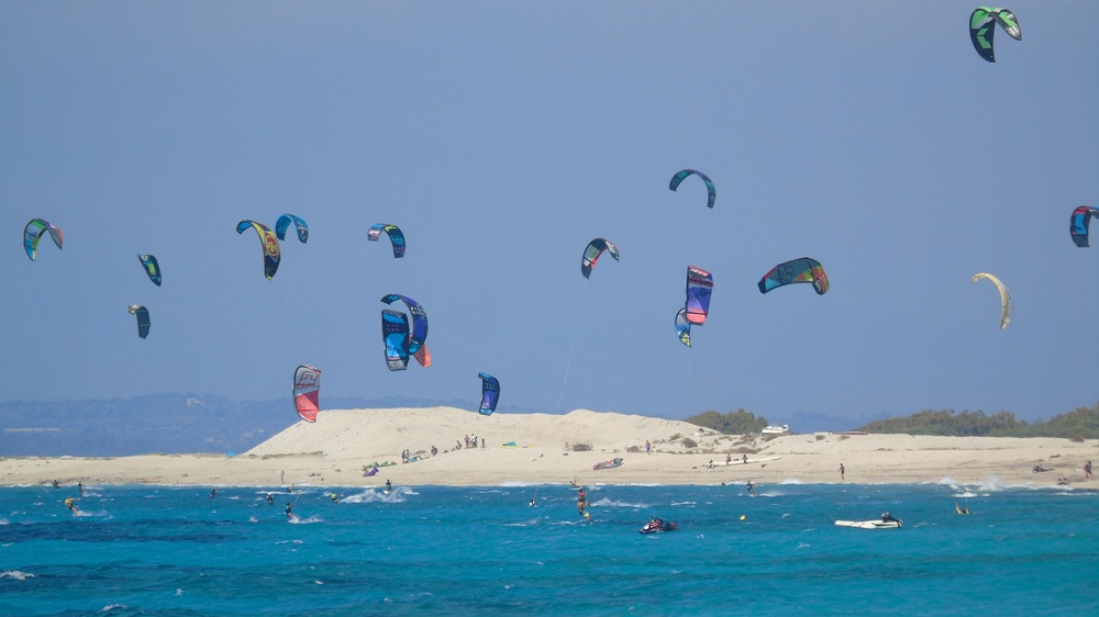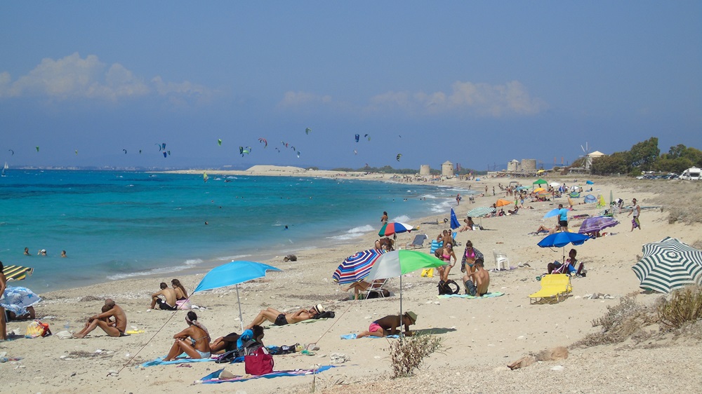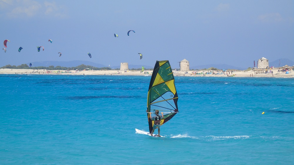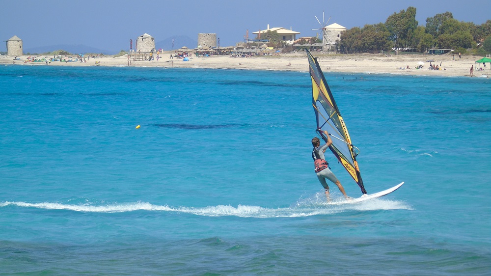 Η μεγάλη παραλία του Αη Γιάννη, μια από τις οκτώ συνολικά παραλίες του νησιού μας στις οποίες κυματίζει η γαλάζια σημαία, είναι στο μεγαλύτερό της μέρος ελεύθερη από ομπρελοκαθίσματα και καλύπτεται από τις 10:30 το πρωί μέχρι τις 5:30 το απόγευμα με ναυαγοσώστη. Το κατ΄ εξοχήν θαλάσσιο άθλημα που ασκείται είναι αυτό της ιστιοσανίδας ενώ σε κοντινή απόσταση, στην παραλία των Μύλων, που αποτελεί συνέχεια της παραλίας του Αη Γιάννη, απορεί κανείς, κοιτάζοντας από μακρυά, πως δεν κουτριόνται μεταξύ τους όλοι αυτοί οι πολύχρωμοι «αετοί» που πλημμυρίζουν τον ουρανό από την εξάσκηση του kitesurfing.