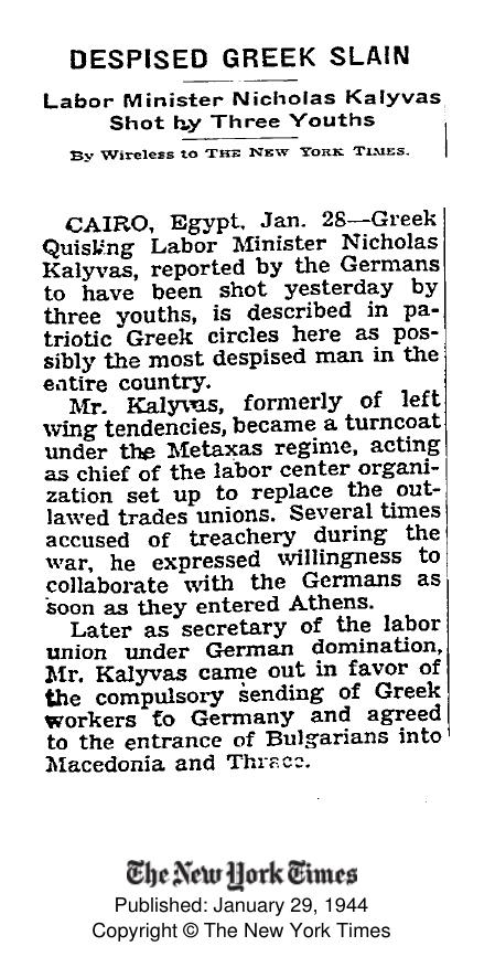 28 Ιανουαρίου – Ο Έλληνας Κουίσλινγκ Υπουργός Εργασίας, σύμφωνα με τις χθεσινές γερμανικές ανταποκρίσεις, φέρεται εκτελεσμένος, από τρεις νέους. Ο δολοφονημένος, περιγράφεται από ελληνικούς πατριωτικούς κύκλους, ίσως ο πιο απεχθής άνθρωπος σε ολόκληρη τη χώρα.