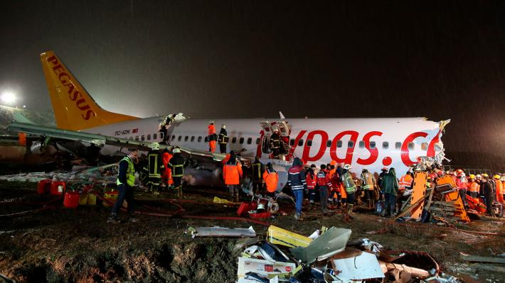Ένας νεκρός και 157 τραυματίες είναι ο απολογισμός του δυστυχήματος που σημειώθηκε το απόγευμα στο αεροδρόμιο «Σαμπιχά Γκιοκτσέν» της Κωνσταντινούπολης, όταν ένα αεροσκάφος «Boeing 737-86J» της «Pegasus Airlines» βγήκε κατά περίπου 30-40 μέτρα εκτός του διαδρόμου προσγείωσης, που ήταν ολισθηρός λόγω της βροχής και κόπηκε στα τρία.