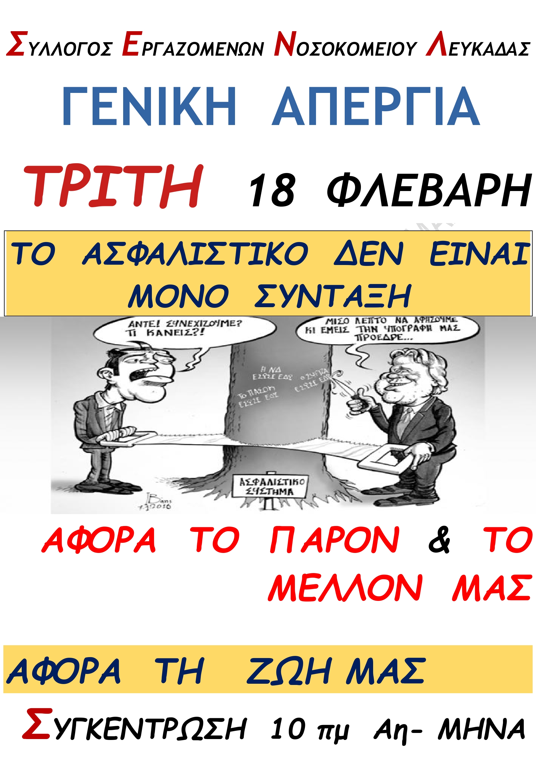 Στην πανελλαδική απεργία στις 18 Φλεβάρη και στην απεργιακή συγκέντρωση στις 10.00 το πρωί στον Άγιο Μηνά καλεί ο Σύλλογος Εργαζομένων του Νοσοκομείου Λευκάδας.