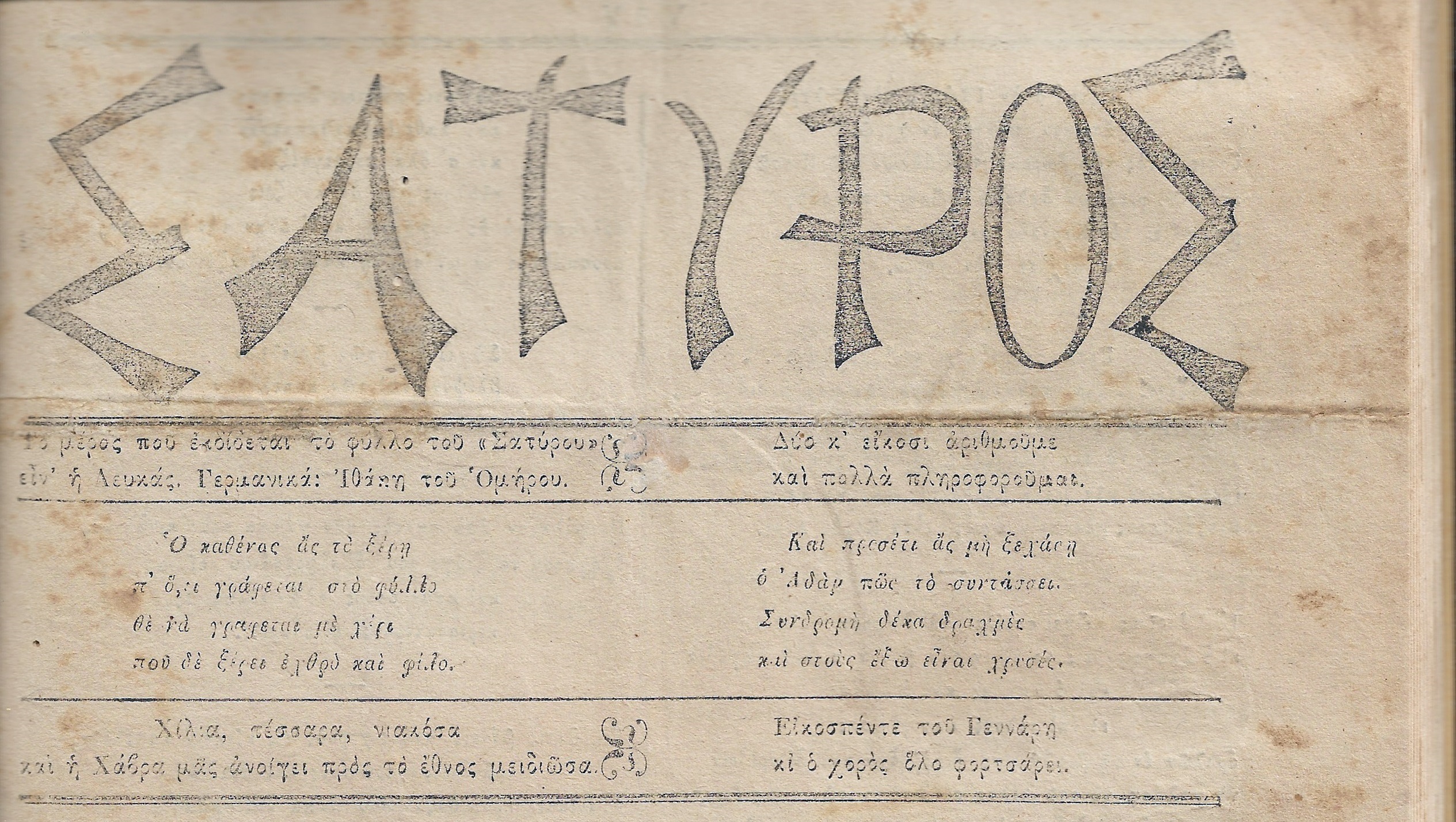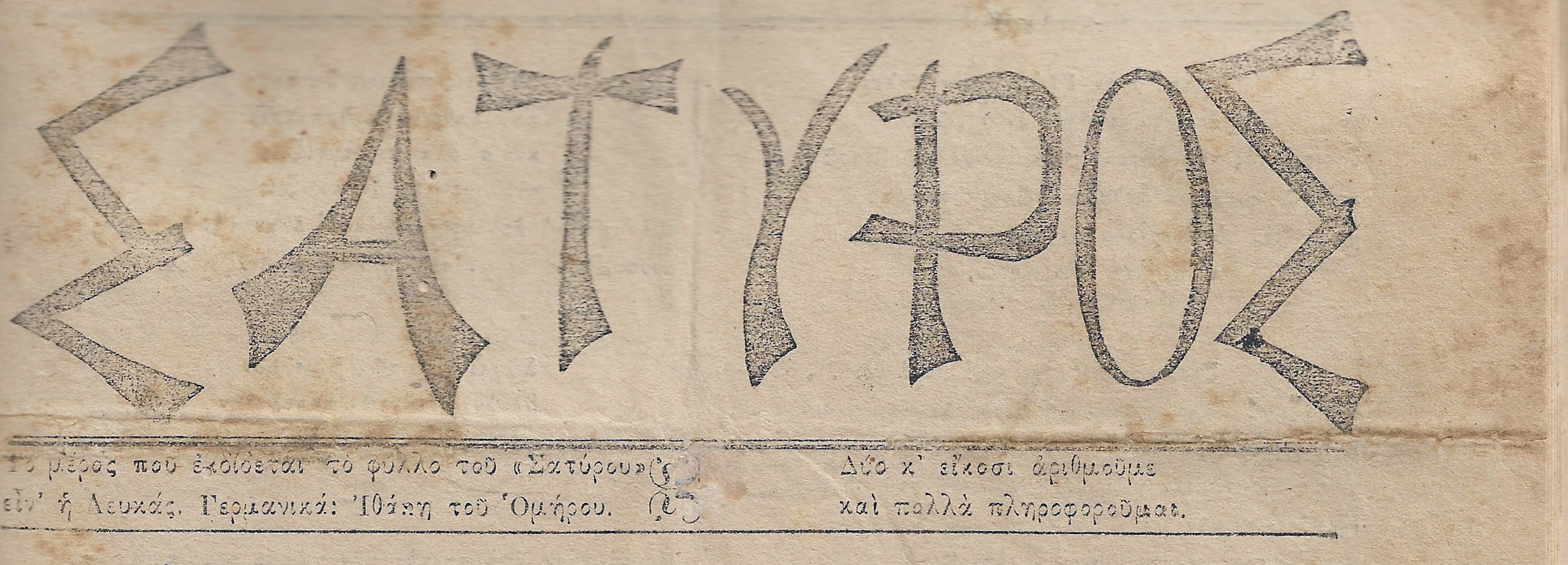 Ο φίλτατος Θωμάς Χόρτης απ’ τα Χορτάτα, άνθρωπος με προσφορά και δράση στα κοινά, αφού επί χρόνια υπηρετεί στο ΔΣ τον Σύλλογο των Λευκαδίων Αττικής, αλλά και ανήσυχος Λευκαδίτης, μας παρέδωσε τα παρόντα φύλλα απ’ την σατυρική εφημερίδα «ΣΑΤΥΡΟΣ», της οποίας αρκετά φύλλα τηρεί σε δερματόδετο τόμο, που εκδίδονταν το 1904 στη Λευκάδα απ’ τον Αδάμ!