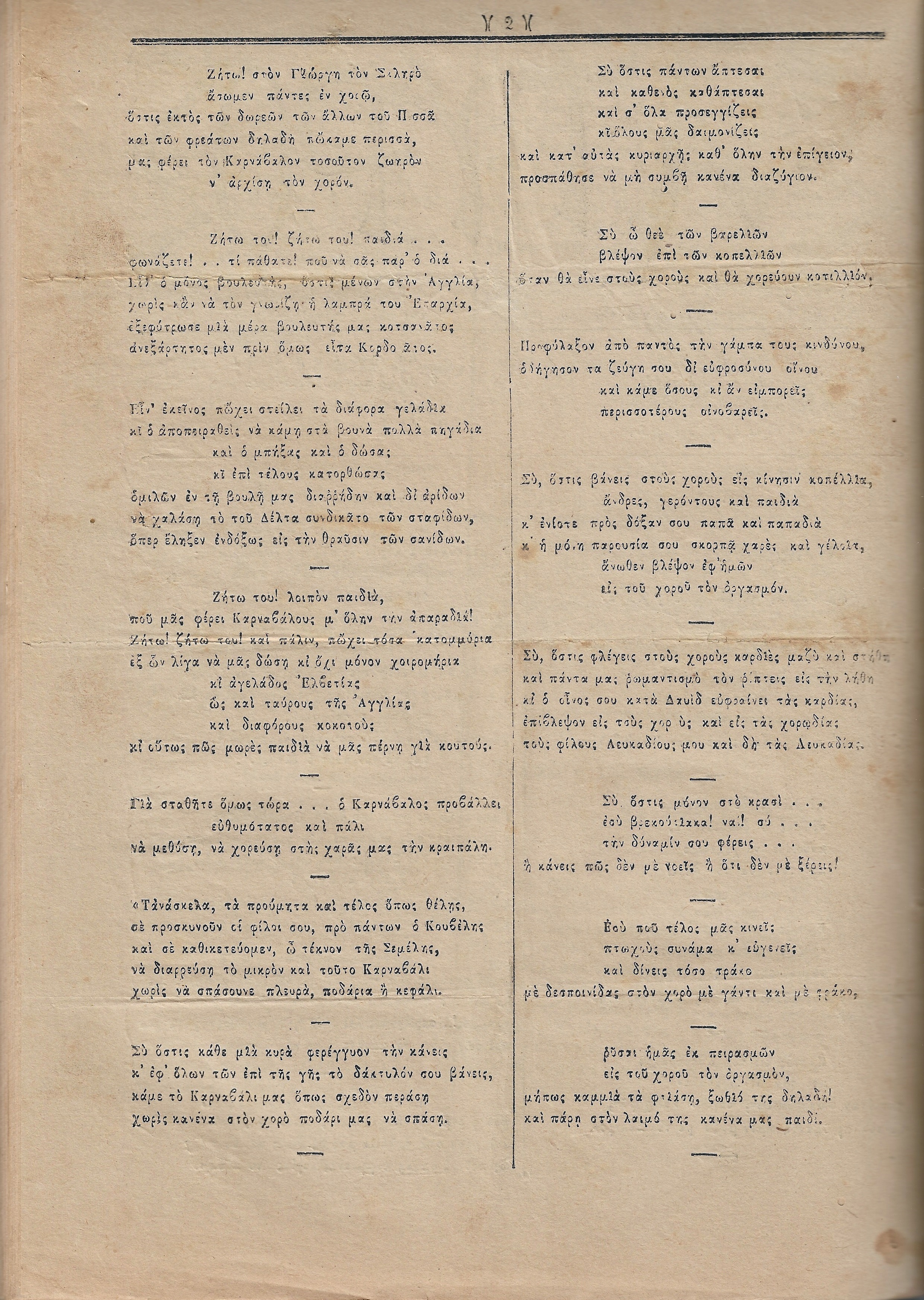 Το σατυρικό ποίημα για τις τότε Λευκαδίτικες Απόκριες είναι ένας «παράδεισος», με επίκεντρο τον υποψήφιο (;) βουλευτή Σκληρό, ο οποίος έφερε απ’ το Λονδίνο τους χορούς και τις παράτες του Καρναβαλιού…