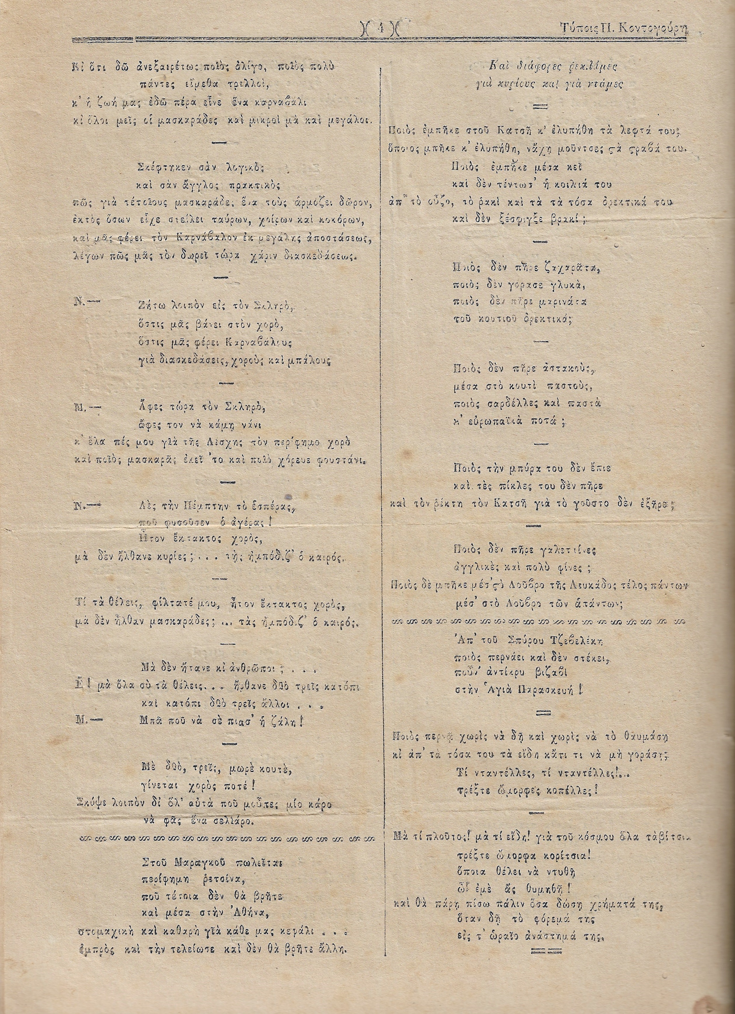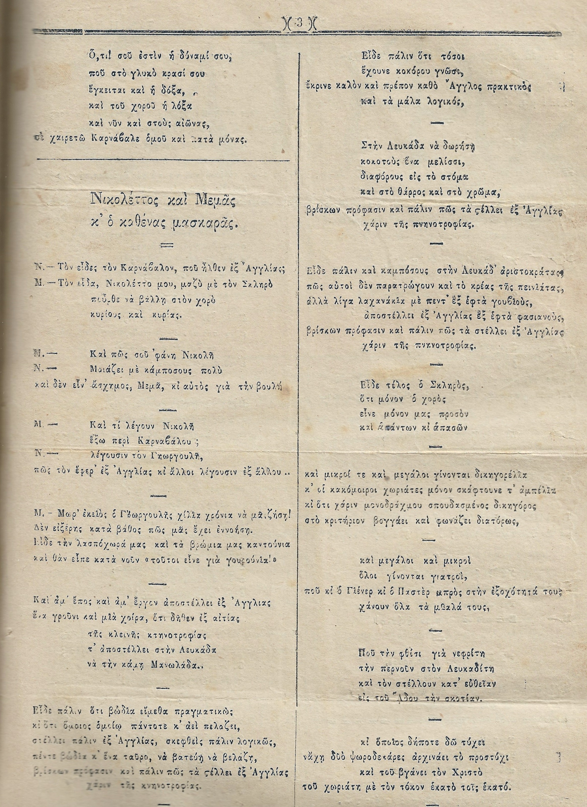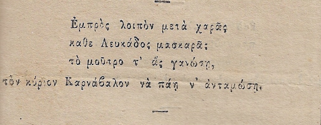 Τα παρόντα φύλλα σατυρίζουν το Λευκαδίτικο καρναβάλι της εποχής με τρόπο καταπληκτικό, ώστε στις μέρες μας, να είναι πέρα από λαογραφία και ιστορία συγχρόνως για τους Λευκαδίτες. Ένα μικρό δείγμα…