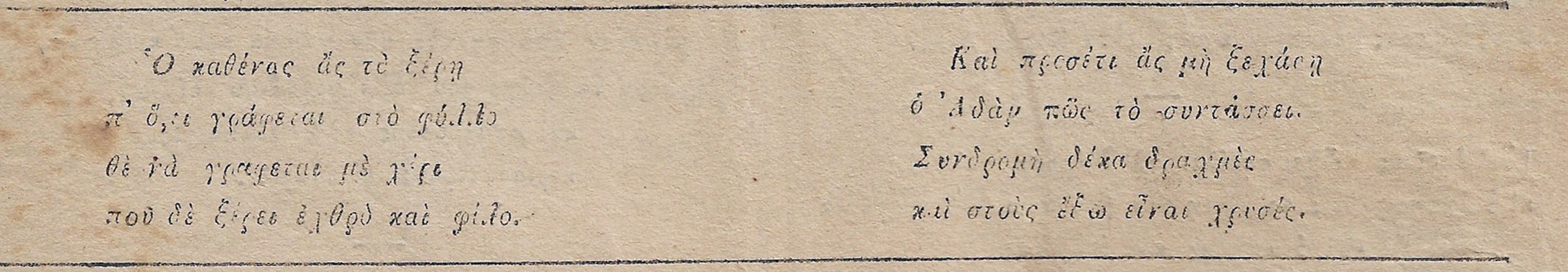 Επίσης στο δεύτερο δίστιχο μας πληροφορεί τον αριθμό του φύλλου της σατυρικής εφημερίδας, είναι το 22ο, άρα, αφού είναι μηνιαία, εκδίδονταν περίπου δύο χρόνια συνεχώς!