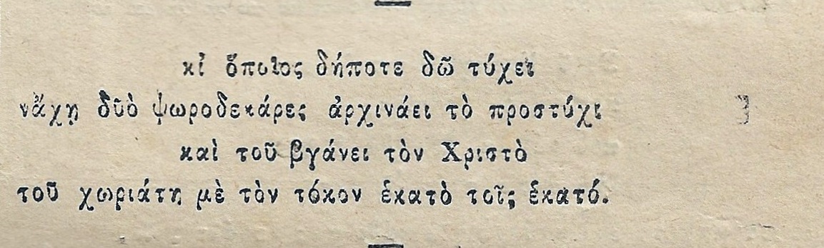 του χωριάτη με τον τόκον εκατό τοις εκατό…»