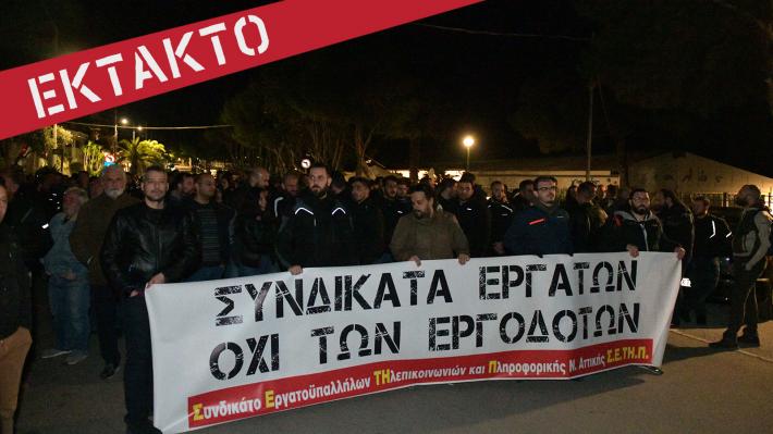 Στα πλαίσια της κινητοποίησης κρατούν πανό που αναγράφει, «Συνδικάτα εργατών όχι των εργοδοτών».