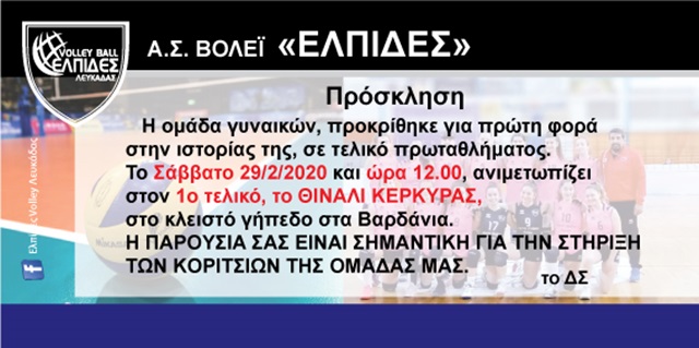 Η ομάδα γυναικών του ΑΣ Βόλεϊ Ελπίδες προκρίθηκε για πρώτη φορά στην ιστορία της σε τελικό πρωταθλήματος και θα αγωνιστεί το Σάββατο 29 Φεβρουαρίου 2020, στις 12.00 το μεσημέρι, στο Κλειστό Γυμναστήριο Λευκάδας, στα Βαρδάνια, στον πρώτο τελικό με το Θινάλι Κέρκυρας.