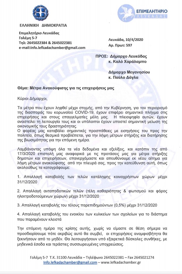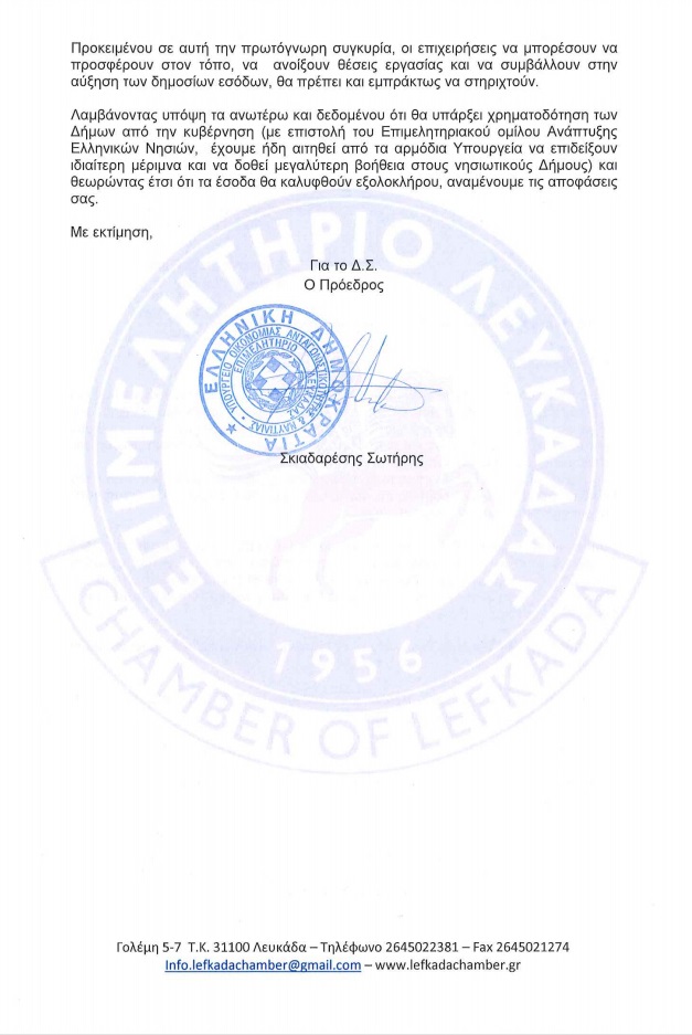 Αναλυτικά η επιστολή του Επιμελητηρίου Λευκάδας: