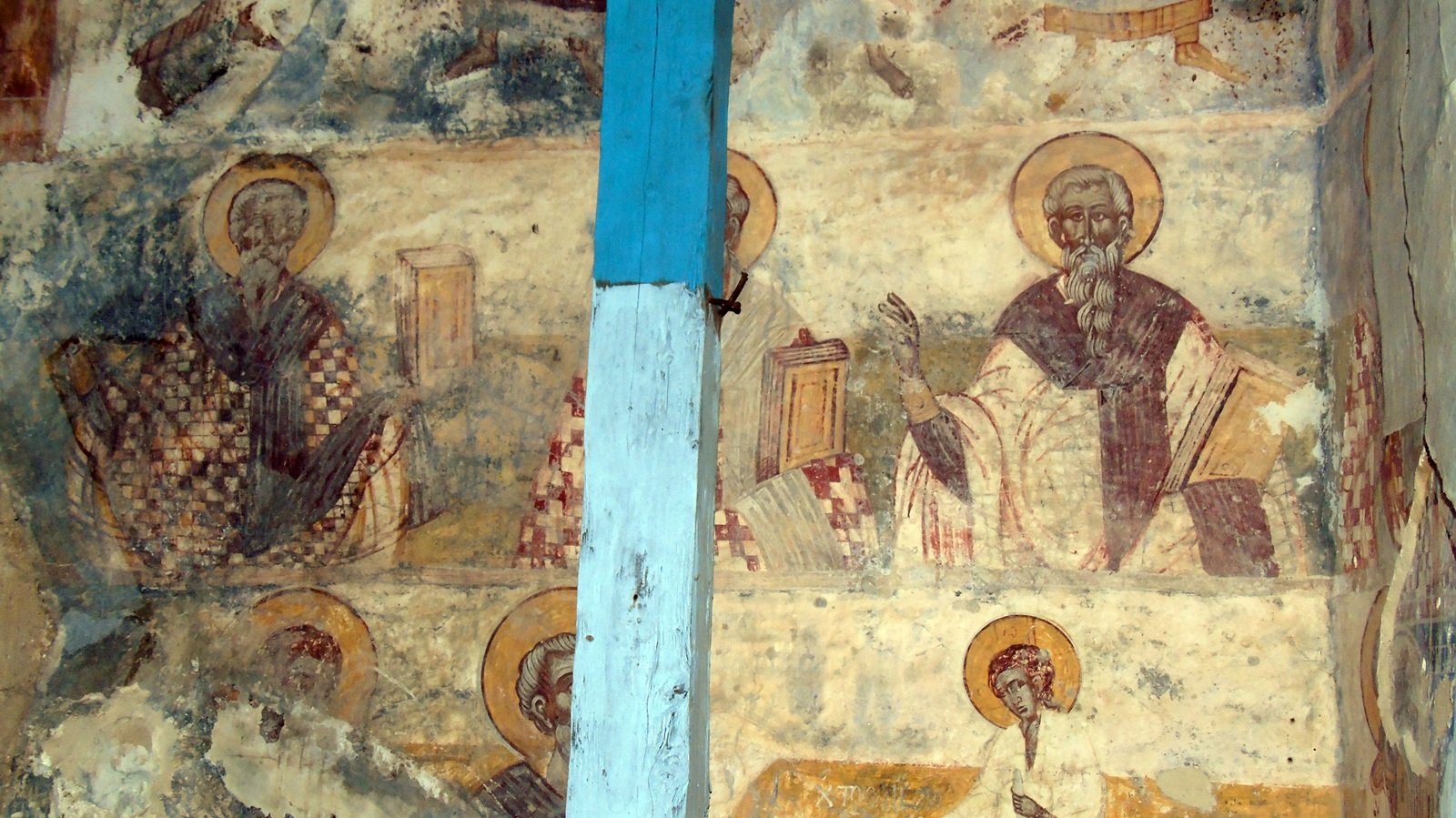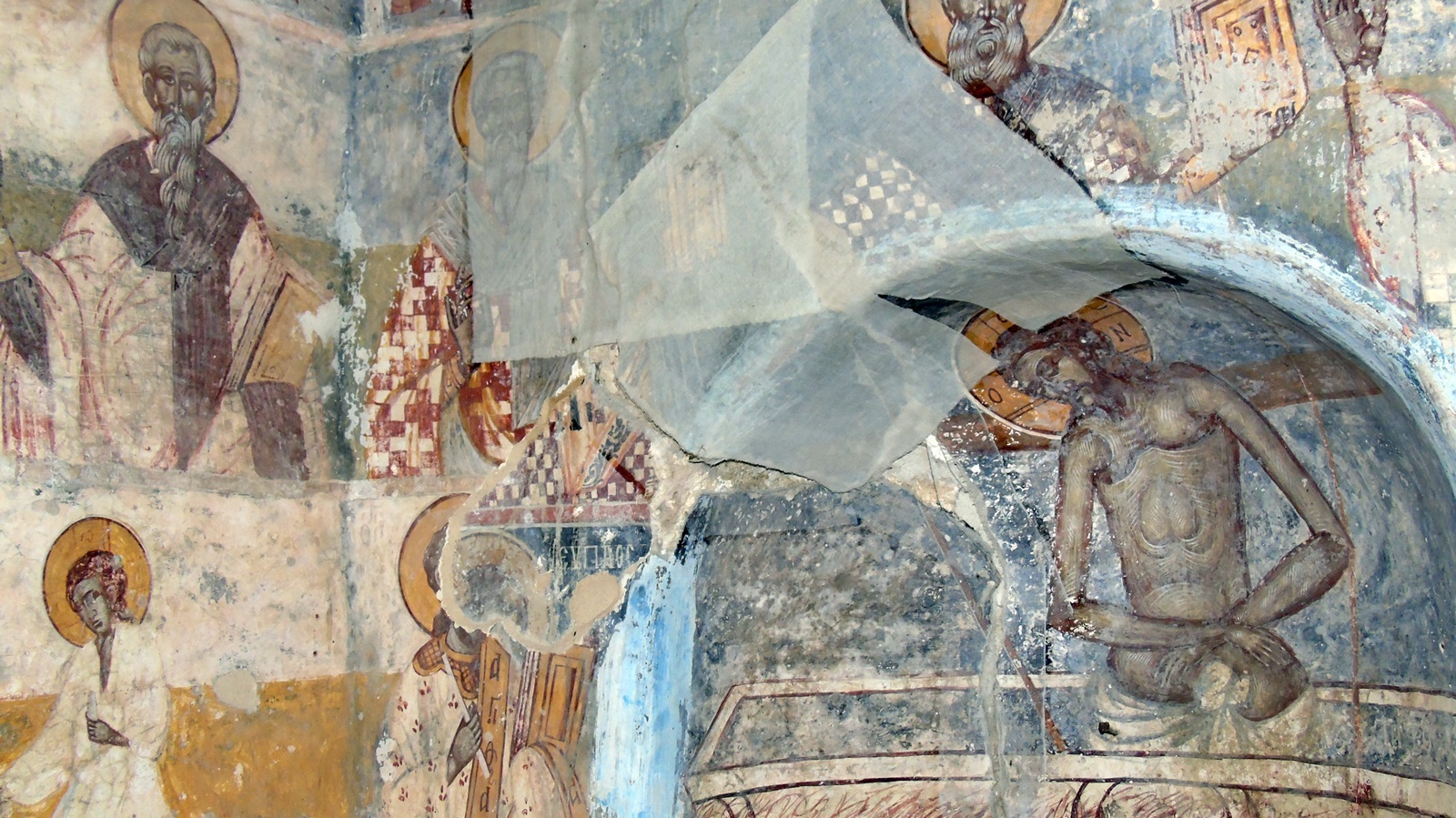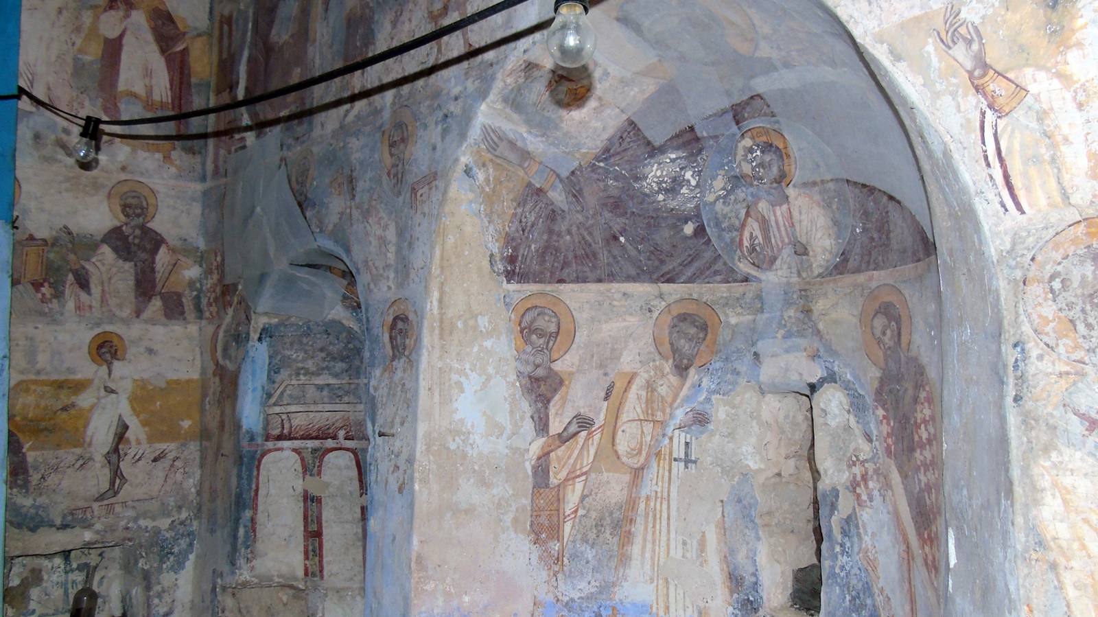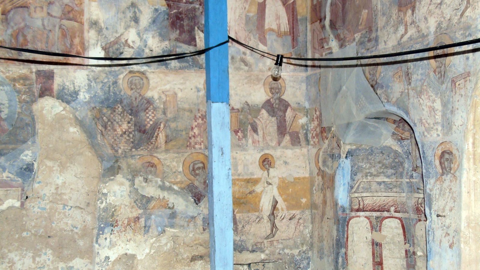 Κατεστραμμένες τοιχογραφίες στο νότιο τοίχο του καθολικού