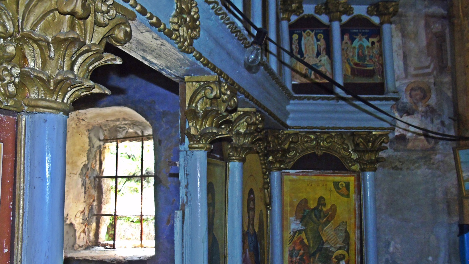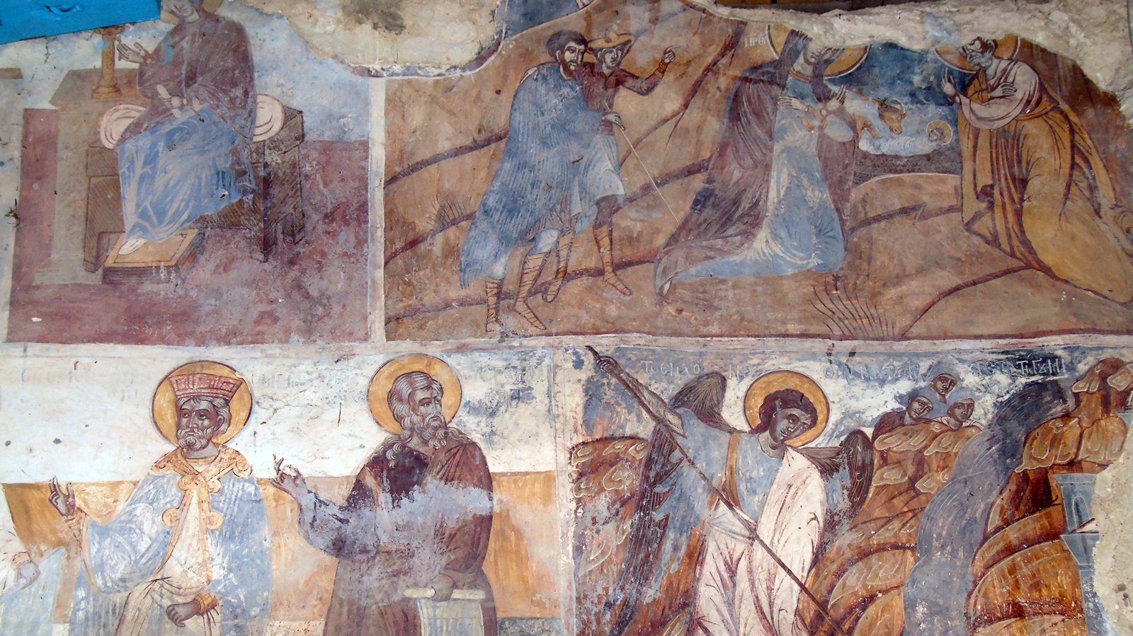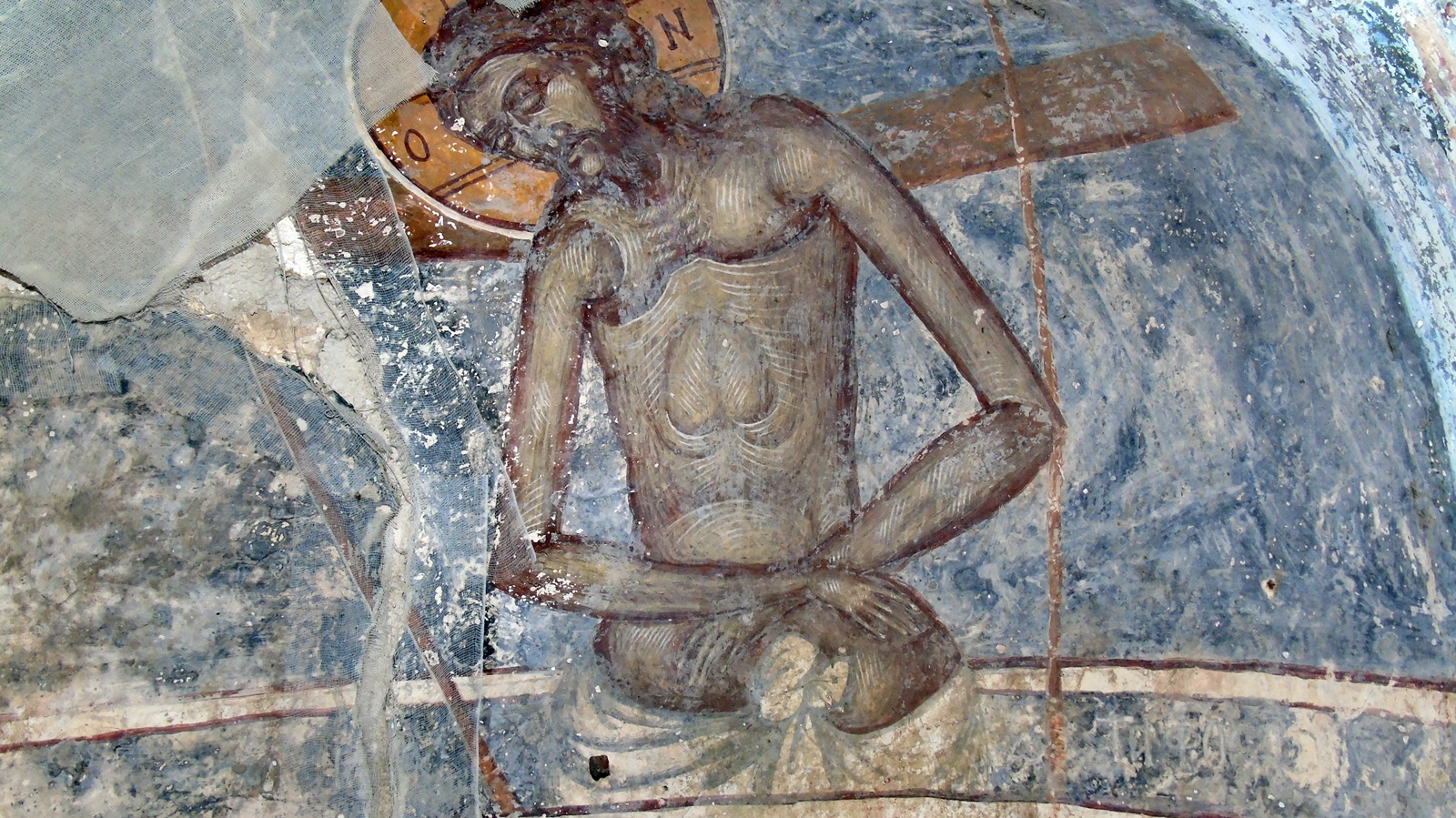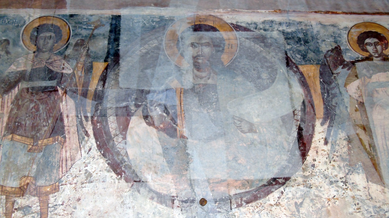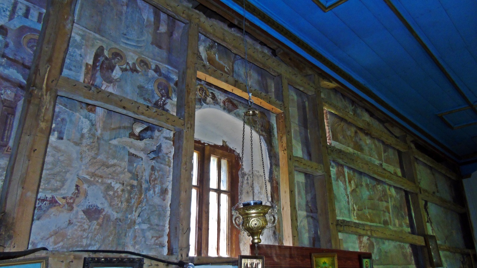 Κατεστραμμένες τοιχογραφίες στο νότιο τοίχο του καθολικού