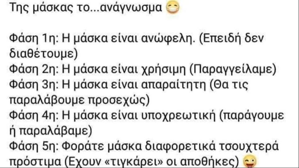 Την ξεκάθαρη άποψη ότι δεν συστήνεται η γενικευμένη χρήση μάσκας εκτός σπιτιού εξέφρασε στην ενημέρωσή του ο εκπρόσωπος του υπουργείου Υγείας για τον κορονοϊό Σωτήρης Τσιόδρας στις 9/4/20. Να μη μας διαφεύγει ότι εκείνη την εποχή παρατηρείται έλλειψη μασκών ακόμη και σε κράτη που διαθέτουν μεγάλα πυρηνικά οπλοστάσια, ικανότητα στρατιωτικών αποστολών στο εξωτερικό και πρωτοπόρο ρόλο στην τεχνολογική εξέλιξη και θα περίμενε κανείς ότι θα είχαν και επάρκεια στα απλά προστατευτικά μέσα για την αποτροπή της διασποράς μιας πανδημίας, με την προϋπόθεση, βέβαια, ότι η οικονομία τους θα ήταν κτισμένη στη βάση της εξυπηρέτησης των κοινωνικών αναγκών και όχι του καπιταλιστικού κέρδους.