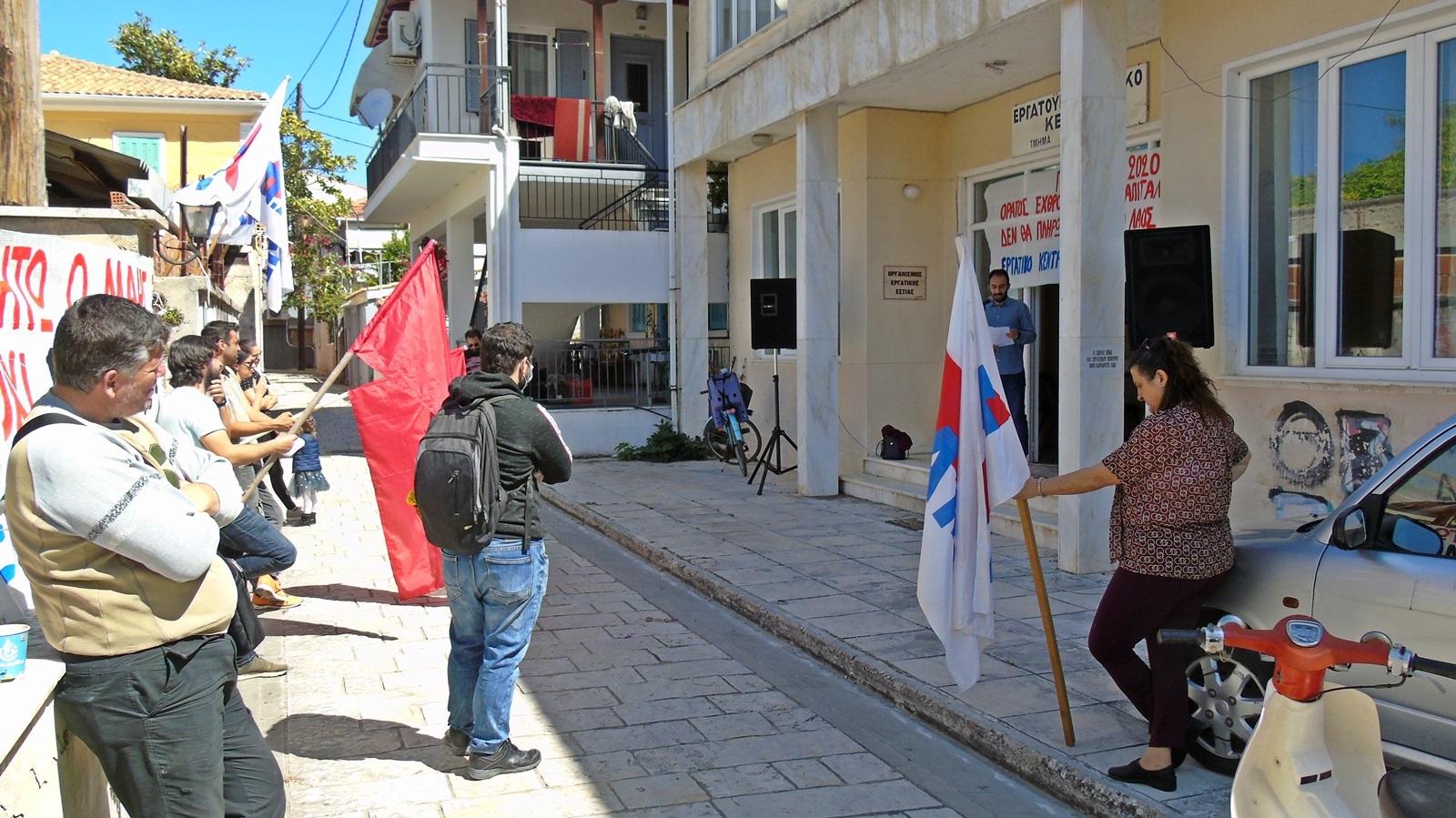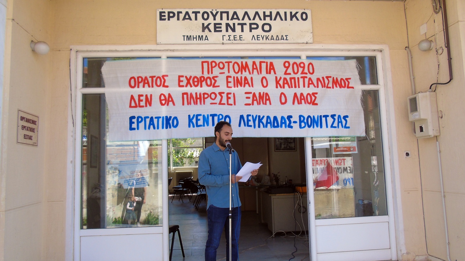 Στην ομιλία του στον προαύλιο χώρο του κτιρίου του Εργατικού Κέντρου ο Αλέξανδρος Βεροιώτης, πρόεδρος του Εργατικού Κέντρου Λευκάδας-Βόνιτσας ανάμεσα στα άλλα σημείωσε: