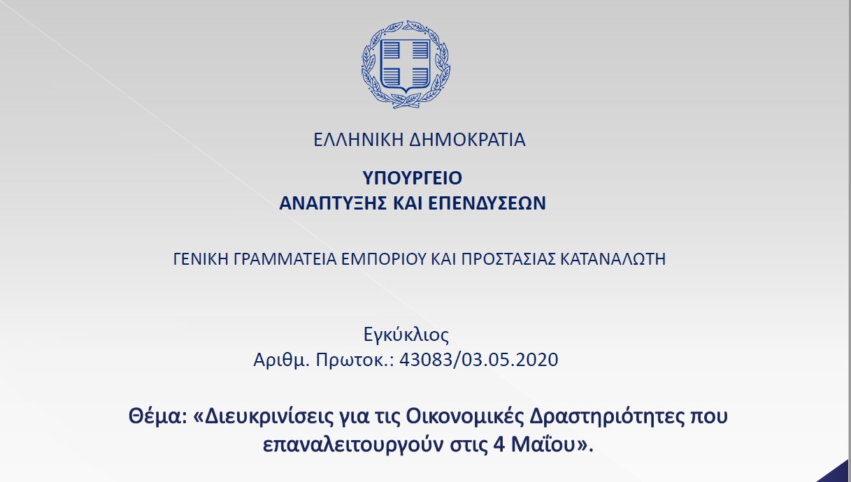 Διευκρινήσεις για τις Οικονομικές Δραστηριότητες που επαναλειτουργούν στις 4 Μαΐου (ΓΕΝΙΚΗ ΓΡΑΜΜΑΤΕΙΑ ΕΜΠΟΡΙΟΥ ΚΑΙ ΠΡΟΣΤΑΣΙΑΣ ΚΑΤΑΝΑΛΩΤΗ)