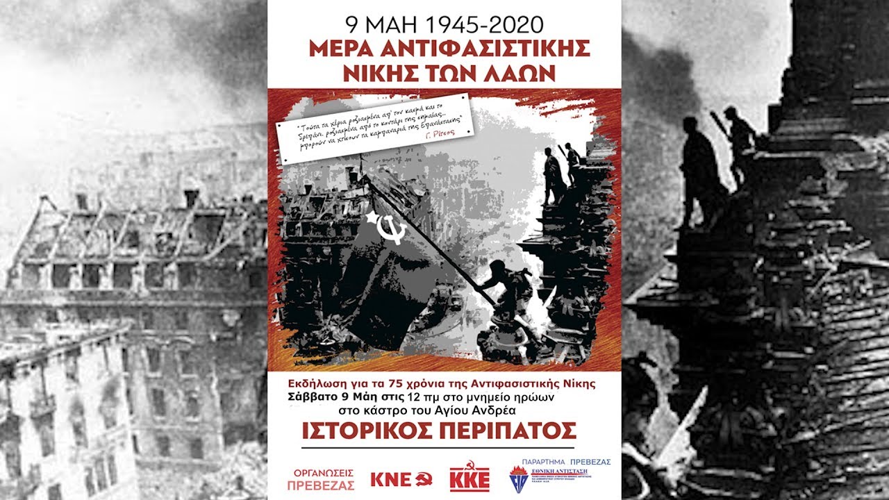 Τιμώντας τα 75 χρόνια από τη Μεγάλη Αντιφασιστική Νίκη των Λαών, την 9η Μάη του 1945, η Κομματική Οργάνωση Πρέβεζας του ΚΚΕ, η Τομεακή Οργάνωση της ΚΝΕ και η Πανελλήνια Ένωση Αγωνιστών Εθνικής Αντίστασης (ΠΕΑΕΑ) οργανώνουν εκδήλωση τιμής και μνήμης το Σάββατο 9 Μάη, στις 12 το μεσημέρι, στο Κάστρο του Αγίου Ανδρέα (μνημείο Ηρώων).