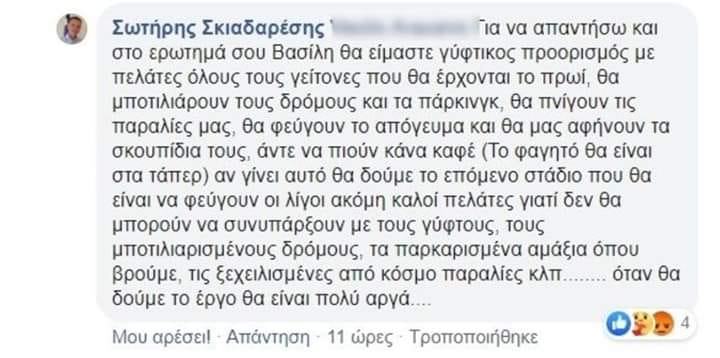 Εντωμεταξύ το σχόλιο έχει αφαιρεθεί, ενώ ο κ. Σκιαδαρέσης έχει ζητήσει δημόσια συγνώμη για το ατυχές συμβάν, λέγοντας ότι η φράση που χρησιμοποίησε αφορούσε τον προορισμό και όχι τους γείτονες.