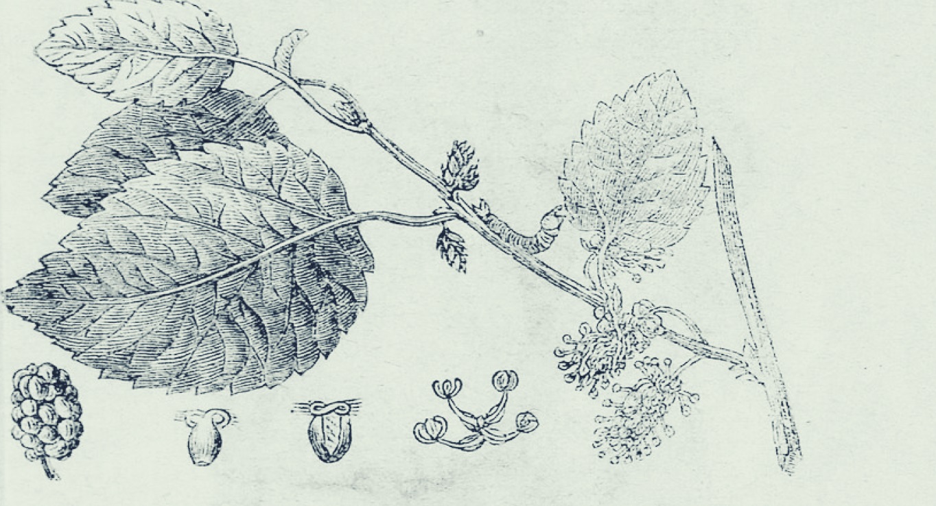 «Το δένδρον τούτο της Περσίας και Κίνας, το οποίον καλλιεργείται και εις την νότιον Ευρώπην, έχει φύλλα ικανώς μεγάλα, καταπράσινα, ωοειδή ή καρδιόσχημα, απλά, ενίοτε εξ εντομών εις ολίγους λοβούς, αδρά, έχοντα τα χείλη, κεχαραγμένα πριονειειδώς. Τα άνθη της είναι αφανή και και εκφύονται πολλά ομού από μικρός τινος μίσχου, όστις βραδύτερον φέρει τον καρπόν, τον κοινώς ονομαζόμενον μούρον.