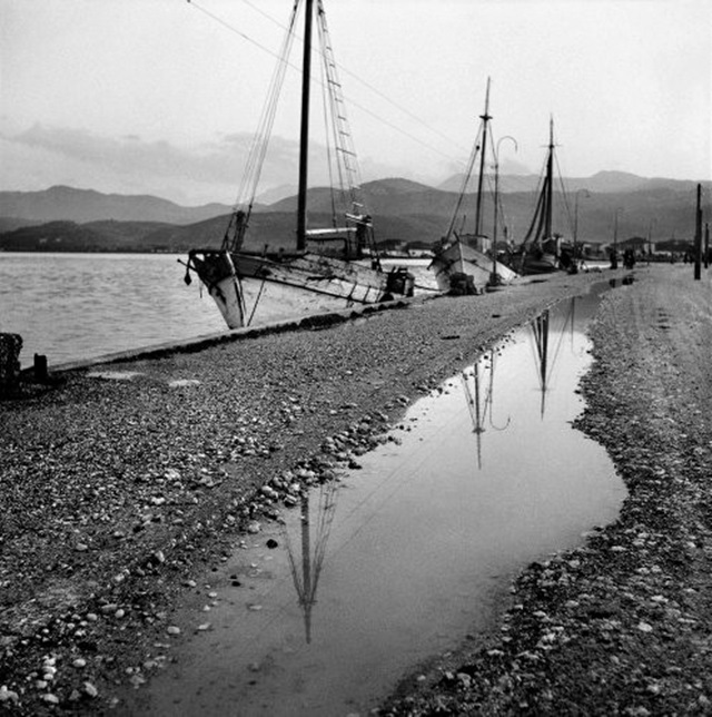 Καΐκια αραγμένα δίπλα από τον δρόμο που οδηγεί στο κάστρο της Λευκάδας, 1950-55.