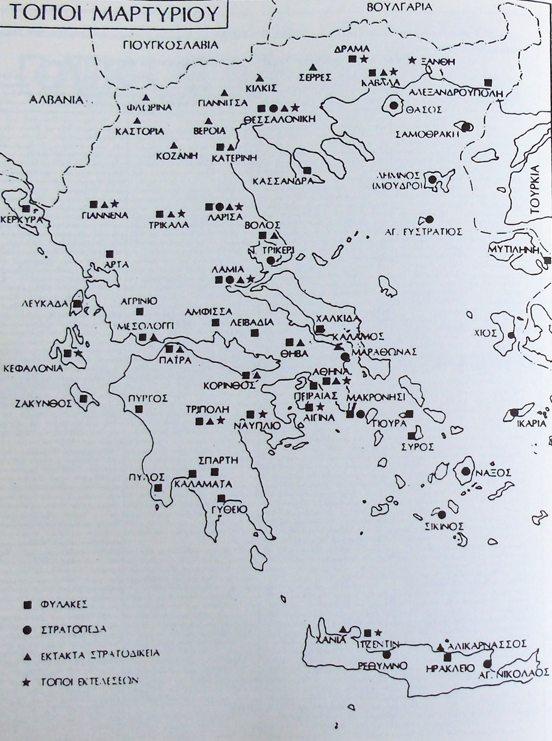 Χάρτης με τις φυλακές, τα στρατόπεδα, τα έκτακτα στρατοδικεία και τους τόπους εκτελέσεων