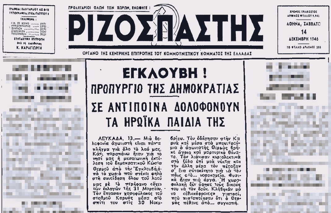Η δολοφονία ενός αγωνιστή, του Κώστα Θερμού, από την Εγκλουβή, που πέθανε από το ξύλο στις 13 Δεκέμβρη του 1946 στα κρατητήρια του Σταθμού Χωροφυλακής Καρυάς, καταγράφεται στις στήλες της εφημερίδας «Ριζοσπάστης», στο φύλλο του Σαββάτου 14 Δεκέμβρη 1946.