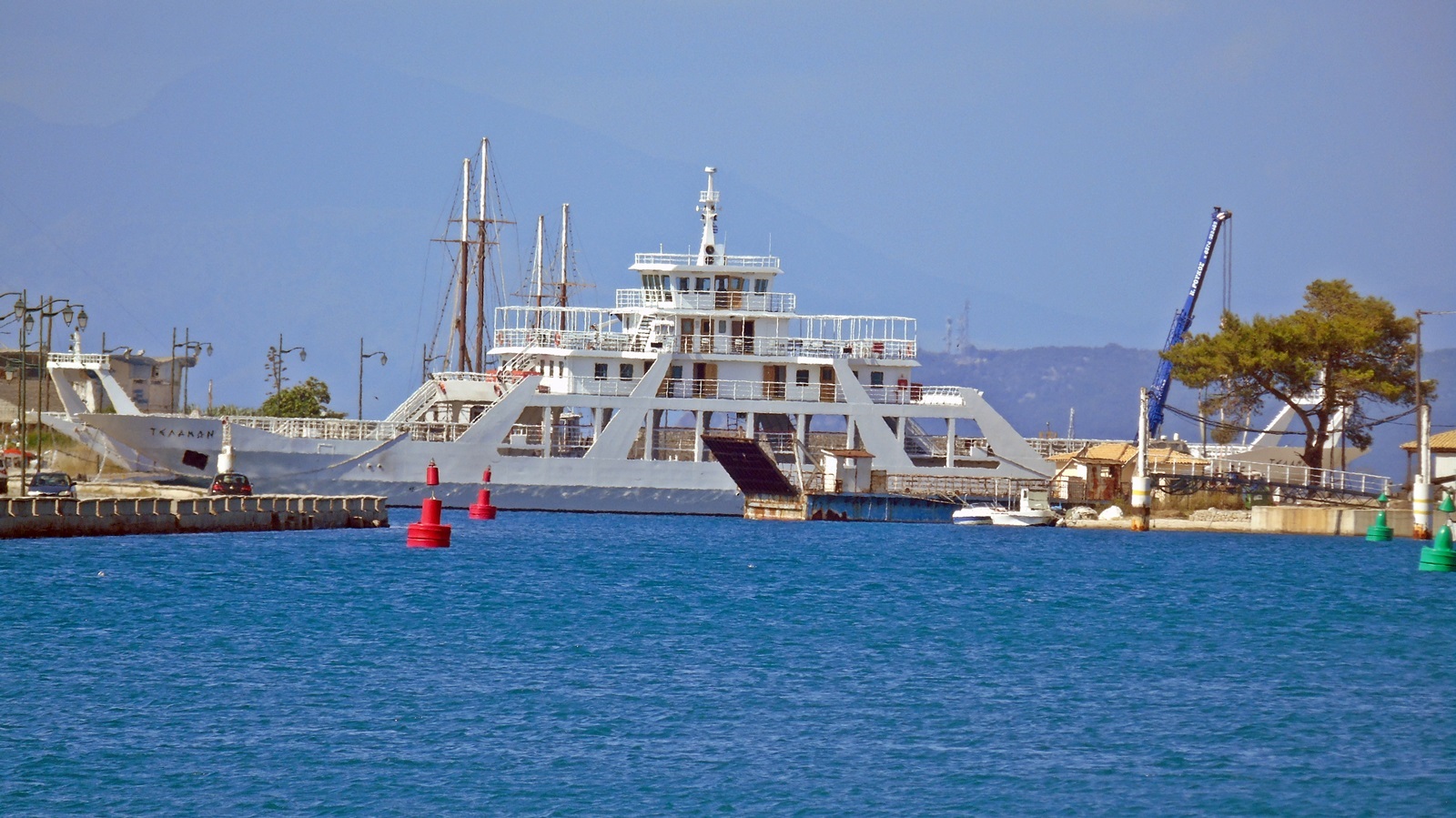 Το πλοίο «παντόφλα» «Τελαμών» που αναπληρώνει την πλωτή γέφυρα της Λευκάδας «Αγία Μαύρα» μέχρι να επιστρέψει από τη συντήρηση στο Πέραμα.