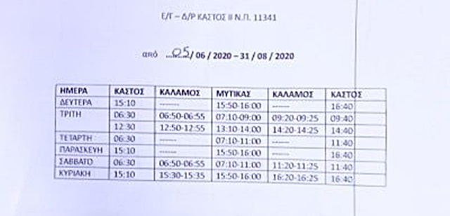 Είναι και το επιβατικό σκάφος «Καστός» που εκτελεί τα δρομολόγια Καστός – Κάλαμος – Μύτικας και επιστροφή, καθημερινά, εκτός Πέμπτης. Ώρες αναχώρησης από Μύτικα για Κάλαμο Τρίτη 09.00 π.μ. και 14.00, Σάββατο 11.00 π.μ., Κυριακή 16.00. Επίσης το «Καστός» κάθε Τετάρτη «πιάνει» και Λευκάδα. Ωρες αναχώρησης από Καστό στις 06.20 π.μ., από Κάλαμο 07.00 π.μ, από Μύτικα 07.20 π.μ. και άφιξη Λευκάδα στις 09.00 π.μ. Αντίστοιχα από εκεί, η αναχώρηση είναι στις 12.30 (τηλ. 6981 149190 Γιάννης).
