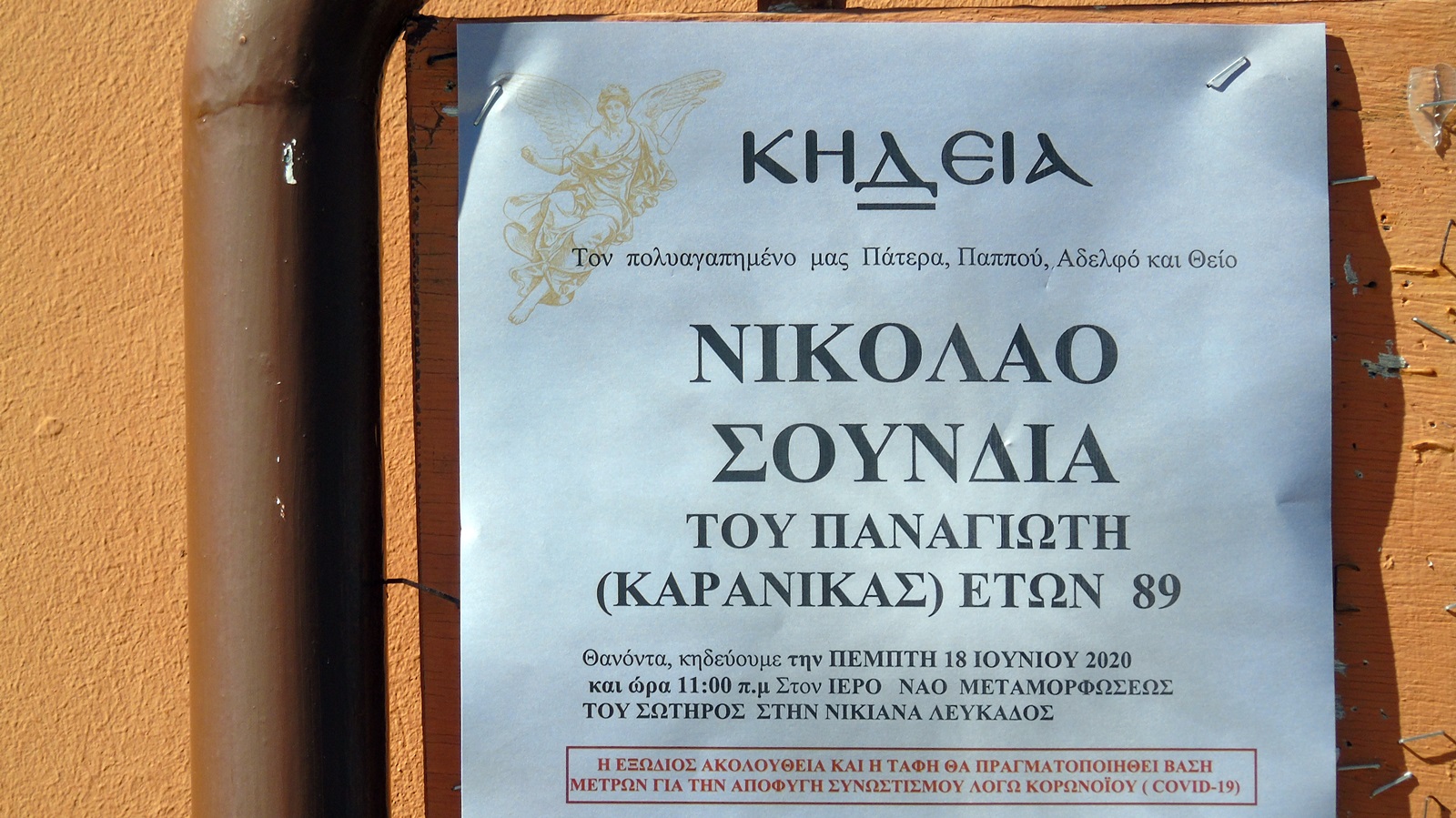 Αύριο, Πέμπτη 18 Ιουνίου 2020, στις 11.00 π.μ., στον ενοριακό ναό Μεταμόρφωσης του Σωτήρος, στη Νικιάνα, θα γίνει η κηδεία του Νικόλαου Σούνδια του Παναγιώτη (Καρανίκα), που πέθανε σε ηλικία 89 ετών.