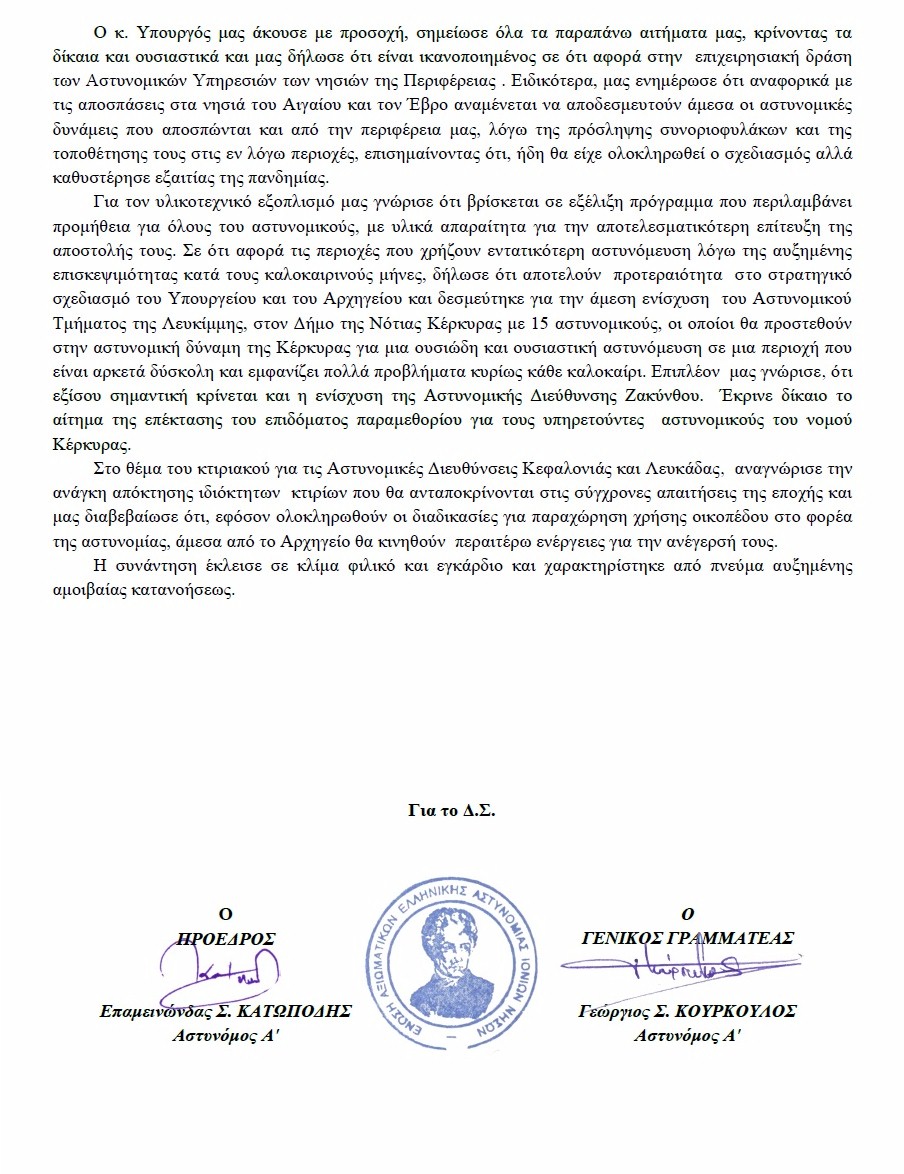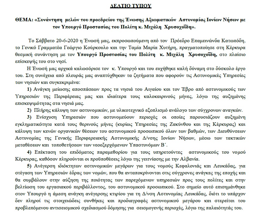 H Ένωση Αξιωματικών Αστυνομίας Ιονίων Νήσων για τη συνάντηση με τον υπ. Προστασίας του Πολίτη κ. Μιχάλη Χρυσοχοΐδη.