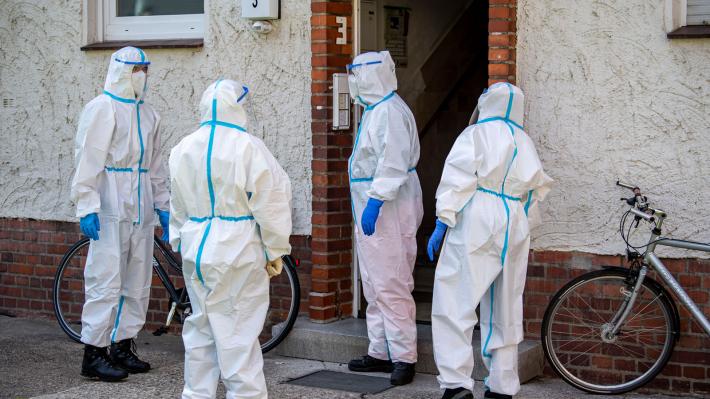 Μέλη του γερμανικού Ερυθρού Σταυρού έξω από σπίτι που μένουν εργάτες του εργοστασίου επεξεργασίας κρέατος (Πηγή: Associated Press)