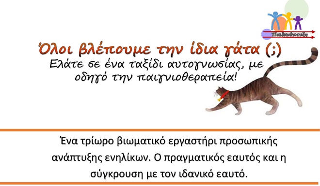 Με ιδιαίτερη χαρά σας προσκαλούμε στο πρώτο εργαστήρι προσωπικής ανάπτυξης ενηλίκων, με τίτλο: «όλοι βλέπουμε την ίδια γάτα;» όπου μέσω του παραμυθιού & του παιγνιδιού θα βρούμε νέους τρόπους ανάπτυξης του εαυτού μας.