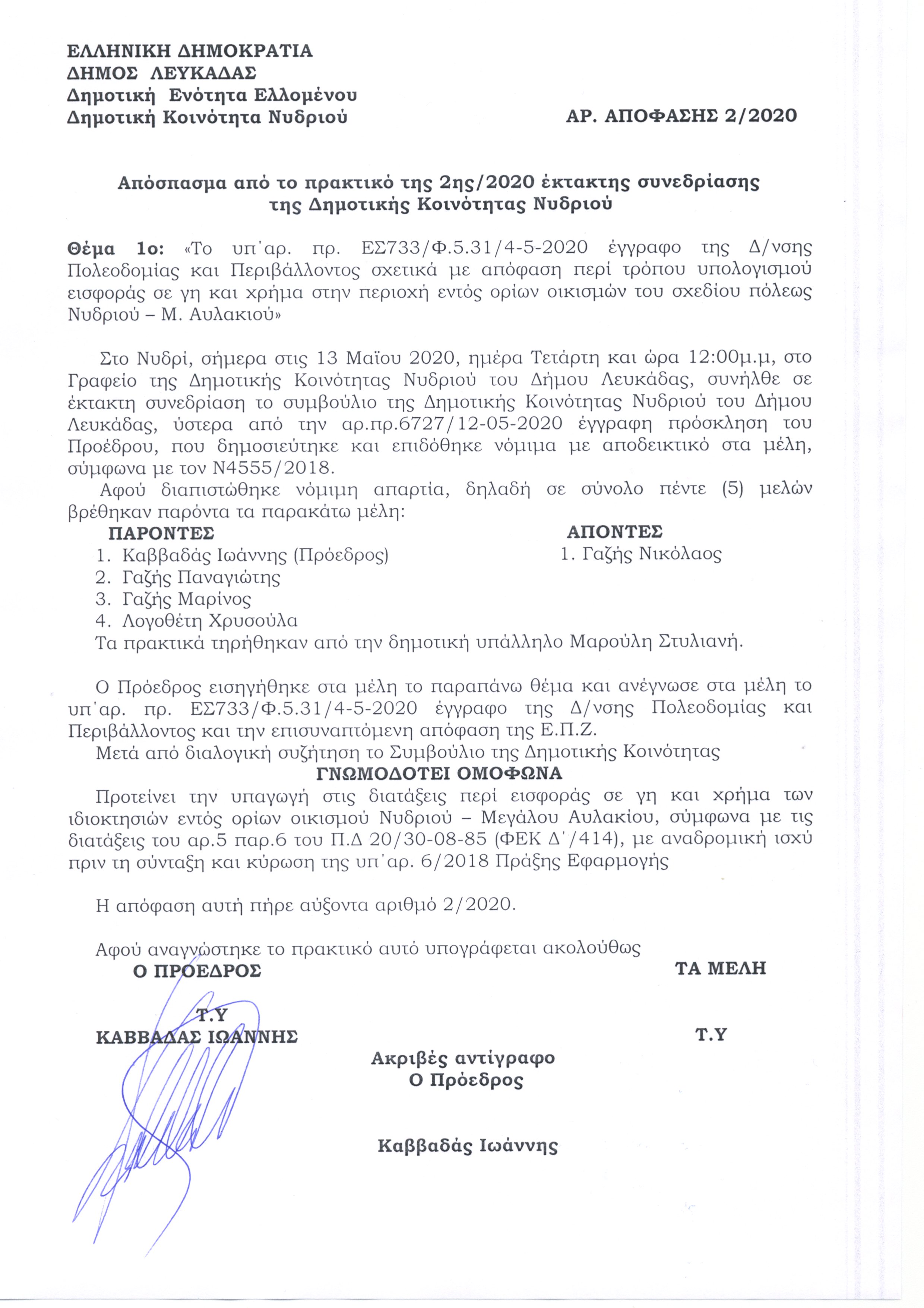 ΘΕΜΑ: Γνωμοδότηση Δ.Σ. περί τρόπου υπολογισμού εισφοράς σε γη και χρήμα στην περιοχή εντός των ορίων οικισμών του σχεδίου πόλεως Νυδριού – Μ. Αυλακίου (σχετ. η υπ΄αριθ. 6/20 αποφ. Ε.Π.Ζ.), προς επικαιροποίηση προηγούμενων σχετικών αποφάσεων. Εισηγητές: Σπυρίδων Λύγδας, Αντιδήμαρχος, Κυριάκος Προκοπίου, Πρ/νος Δ/νσης Πολεοδομίας & Περιβάλλοντος.