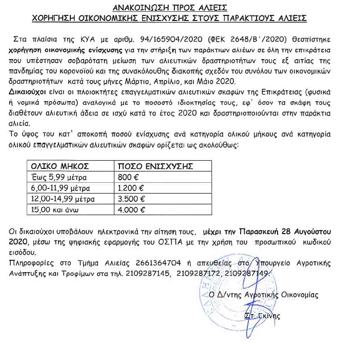Αναλυτικά η ανακοίνωση του Τμήματος Αλιείας της Διεύθυνσης Αγροτικής Ανάπτυξης της Περιφέρειας Ιονίων Νήσων:
