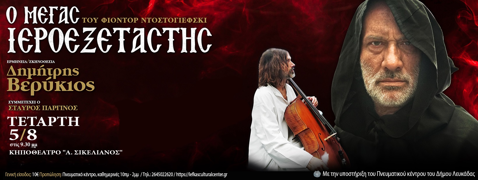 Ο Δημήτρης Βερύκιος σκηνοθετεί και ερμηνεύει τον μονόλογο «Ο ΜΕΓΑΣ ΙΕΡΟΕΞΕΤΑΣΤΗΣ», από το ομώνυμο κεφάλαιο του κορυφαίου έργου ΑΔΕΛΦΟΙ ΚΑΡΑΜΑΖΩΦ του Φιοντόρ Ντοστογιέφσκι, συνεχίζοντας να εμπνέεται από το πνεύμα του μεγάλου συγγραφέα και διανοητή.