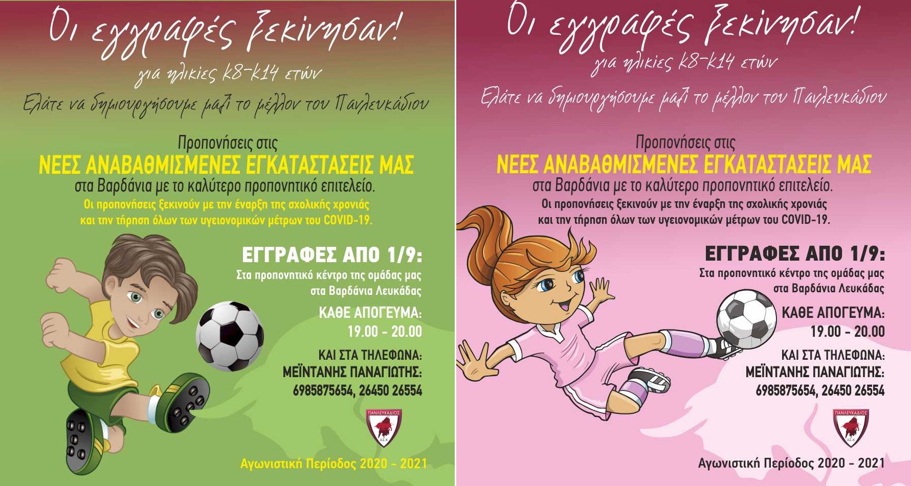 Όπως ανακοινώνει ο Πανλευκάδιος ξεκινούν από 1 Σεπτέμβρη οι εγγραφές για το γυναικείο τμήμα ποδοσφαίρου και ηλικίες Κ8-Κ14 καθώς και τις Ακαδημίες ποδοσφαίρου, σε συνεργασία με τον Ατρόμητο, για ηλικίες Κ8-Κ14.